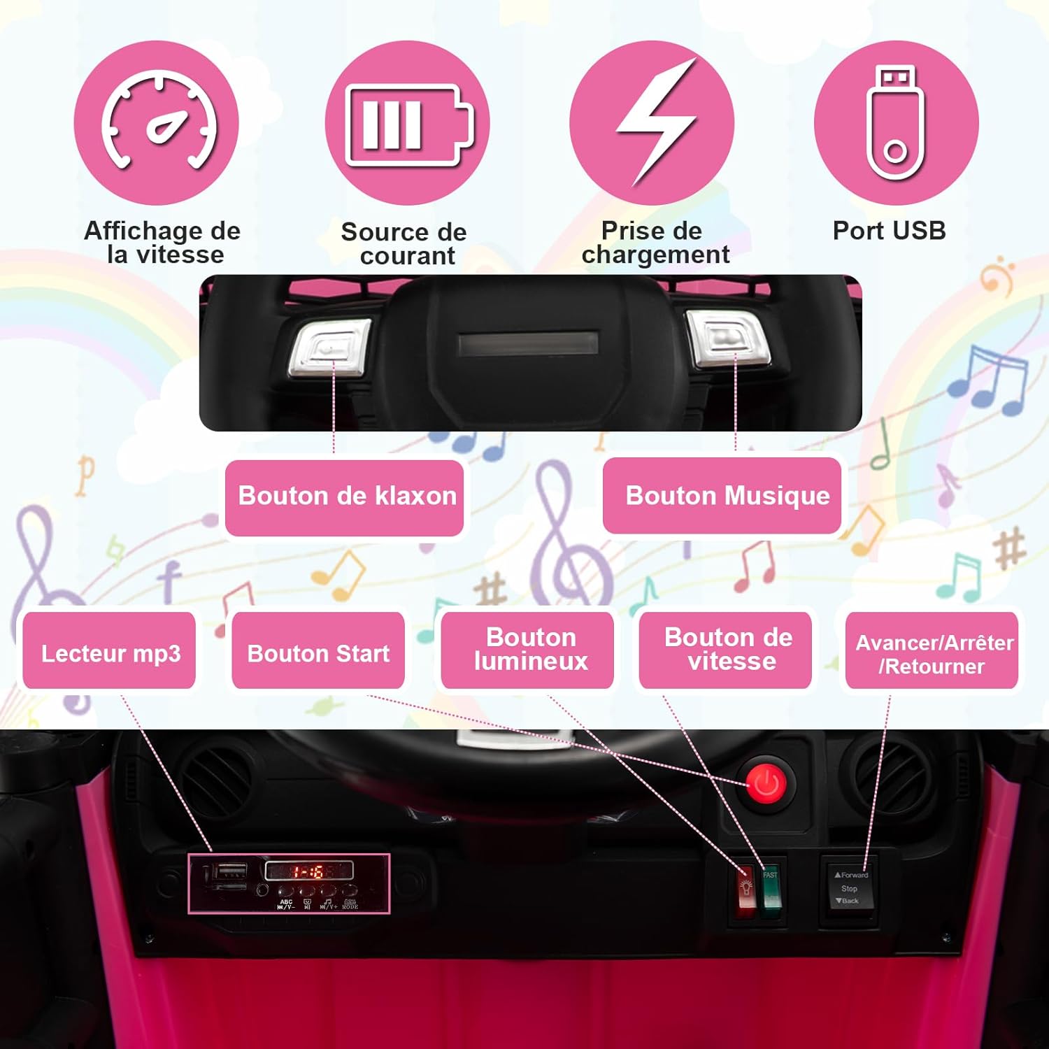- Détails bien pensés : Cette quad electrique pour enfant dispose d’un panneau numérique qui affiche en temps réel le niveau de la batterie, offrant plus de commodités. Les roues antidérapantes permettent à la voiture de circuler sur différents types de sols sans glissements, et l’enfant peut écouter de la musique tout en conduisant.