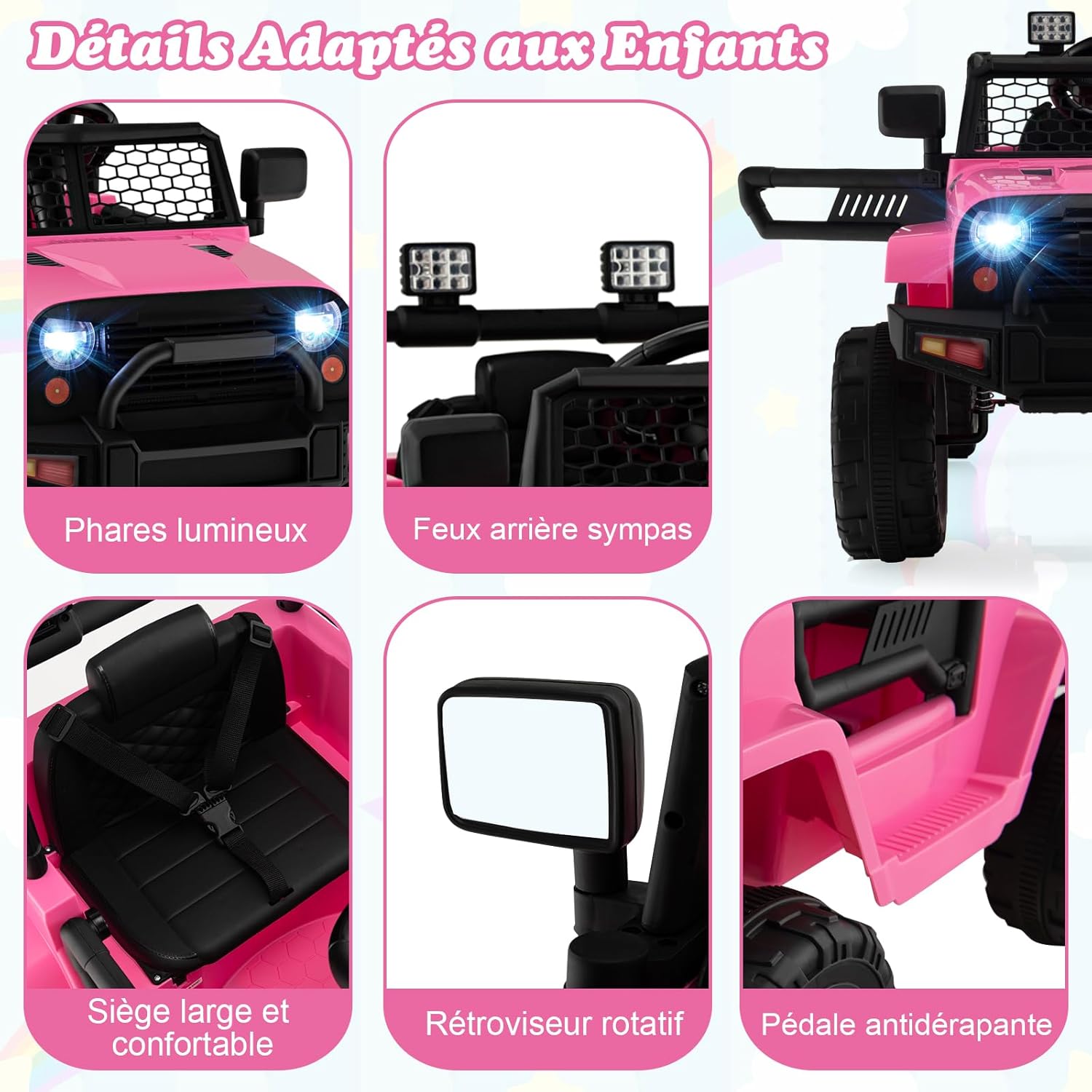 - Cadeau parfait : Notre voiture electrique enfant adopte parfaitement une apparence authentique d’une vraie voiture. Nous vous offrons 2 couleurs (rose/noir) au choix qui sont toutes élégantes et de bon goût. Elle convient pour les enfants de 3~7 ans, et apportera sans doute des souvenirs mémorables dans leur enfance.