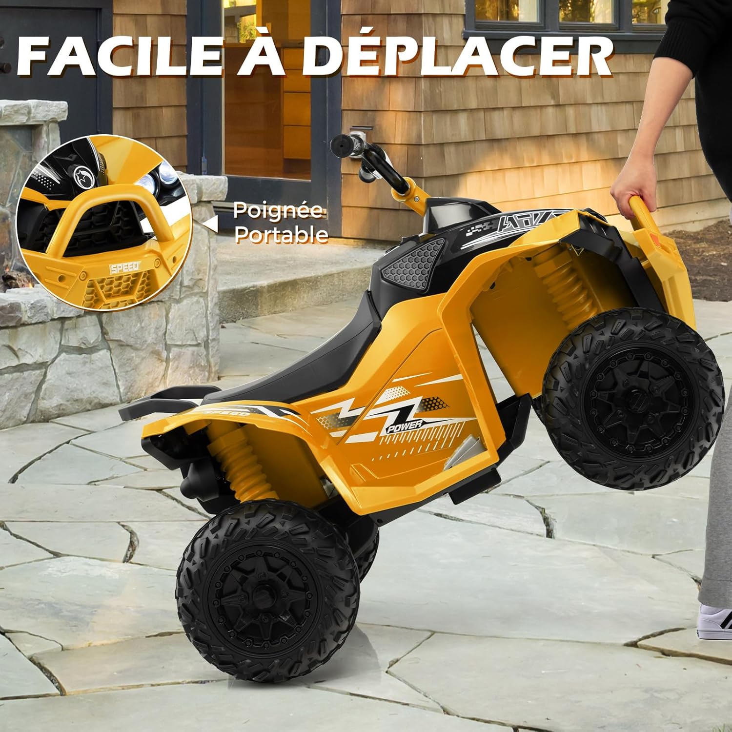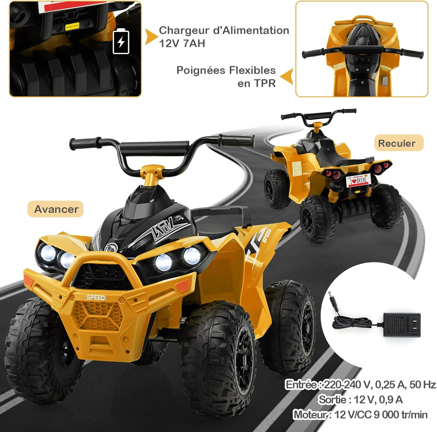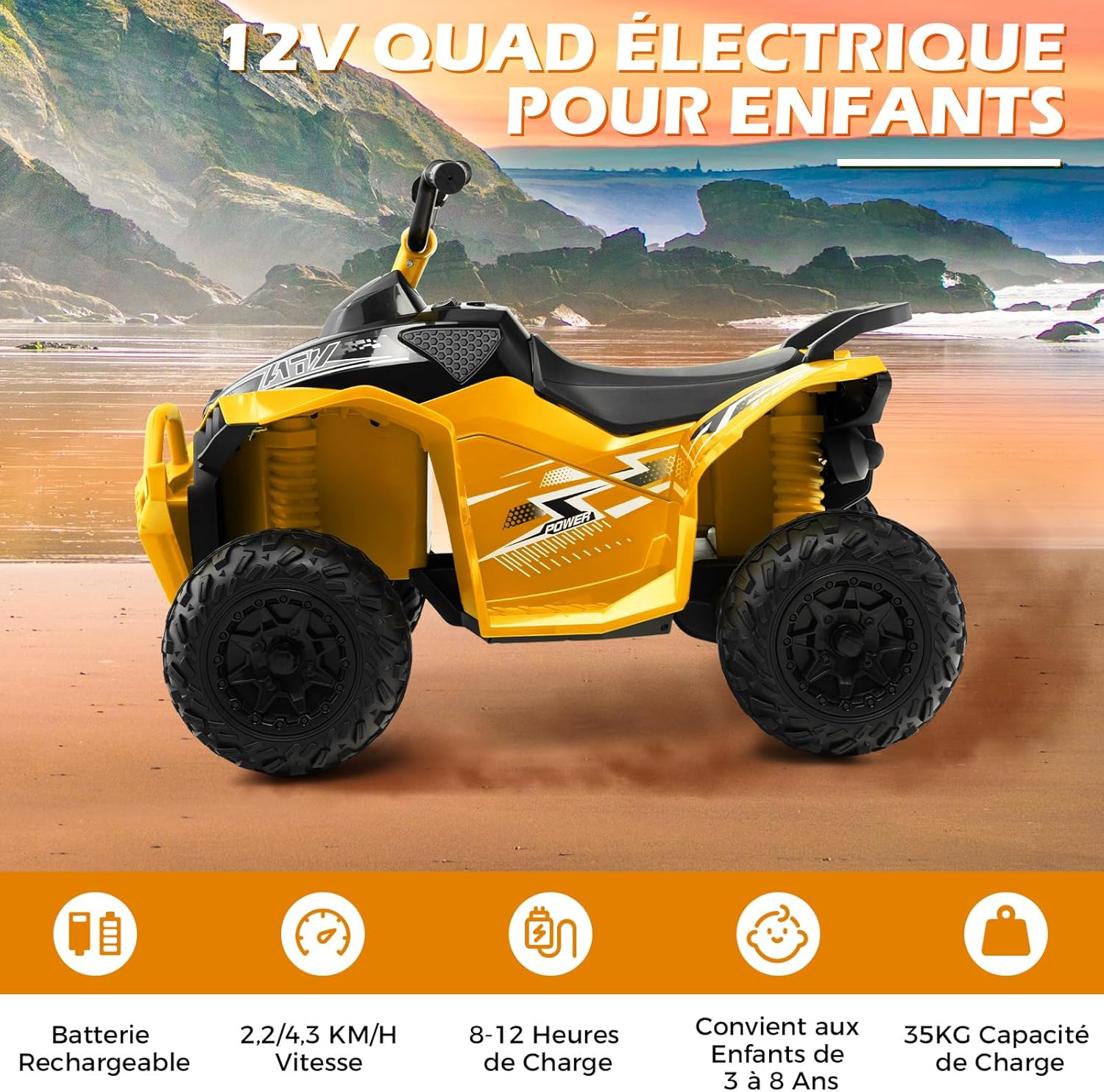 Voiture electrique enfants 12v, quad electrique 1 place 2,2-4,3 km/he, klaxon, musique, phares led,jaune