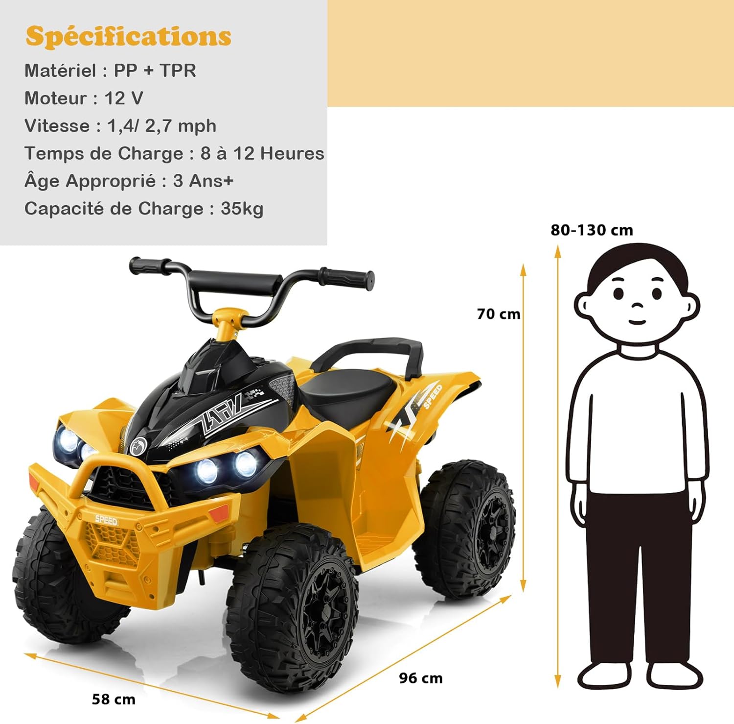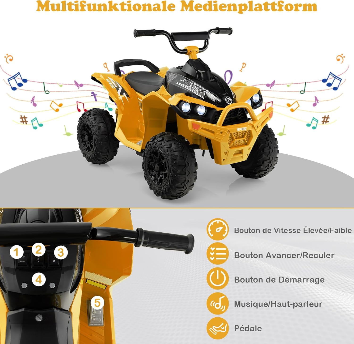 | Libellé | Voiture electrique enfants 12v, quad electrique 1 place 2,2-4,3 km/he, klaxon, musique, phares led,jaune |