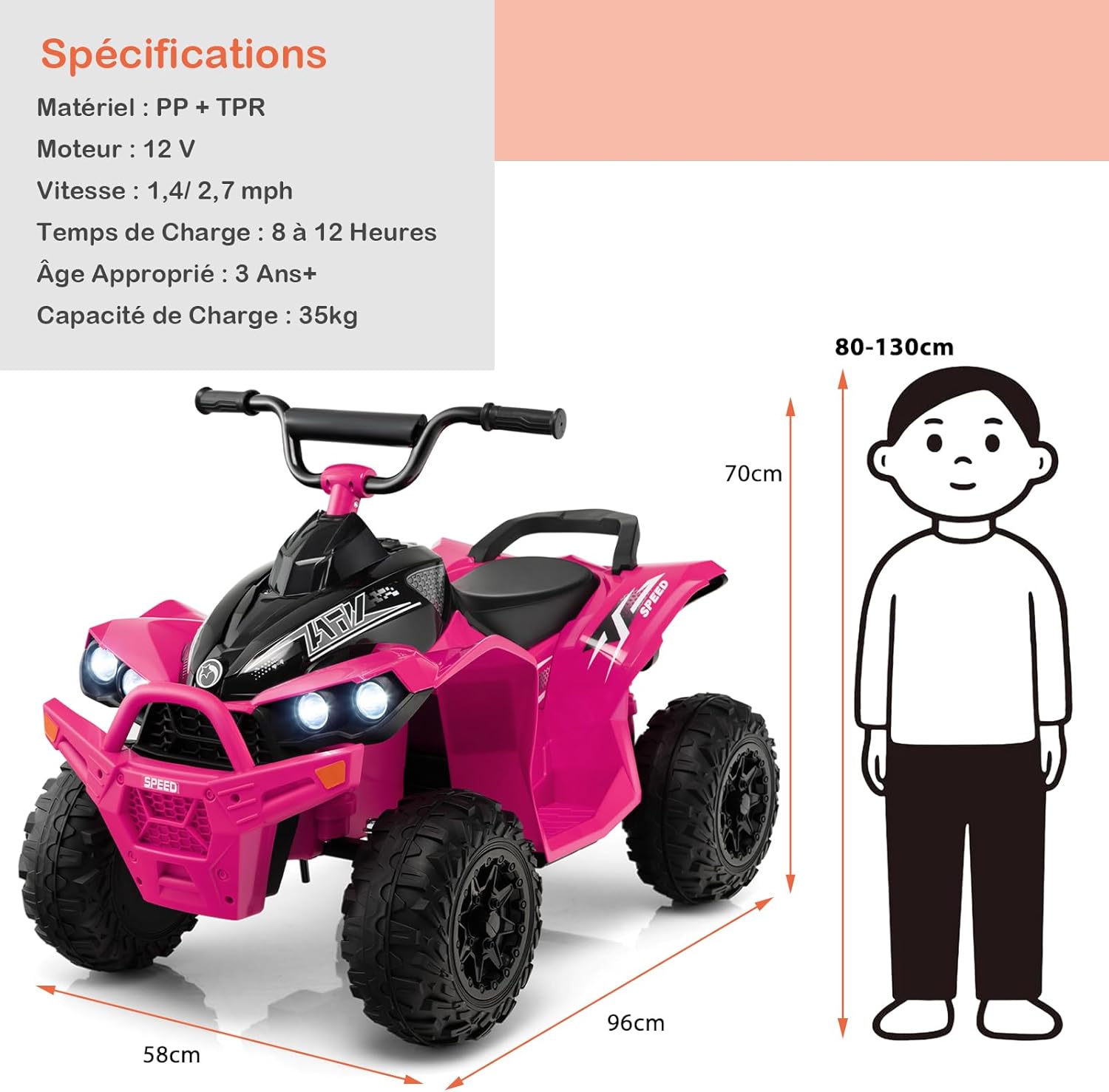 | Libellé | Voiture electrique enfants 12v, quad electrique 1 place 2,2-4,3 km/he, klaxon, musique, phares led,rose |
