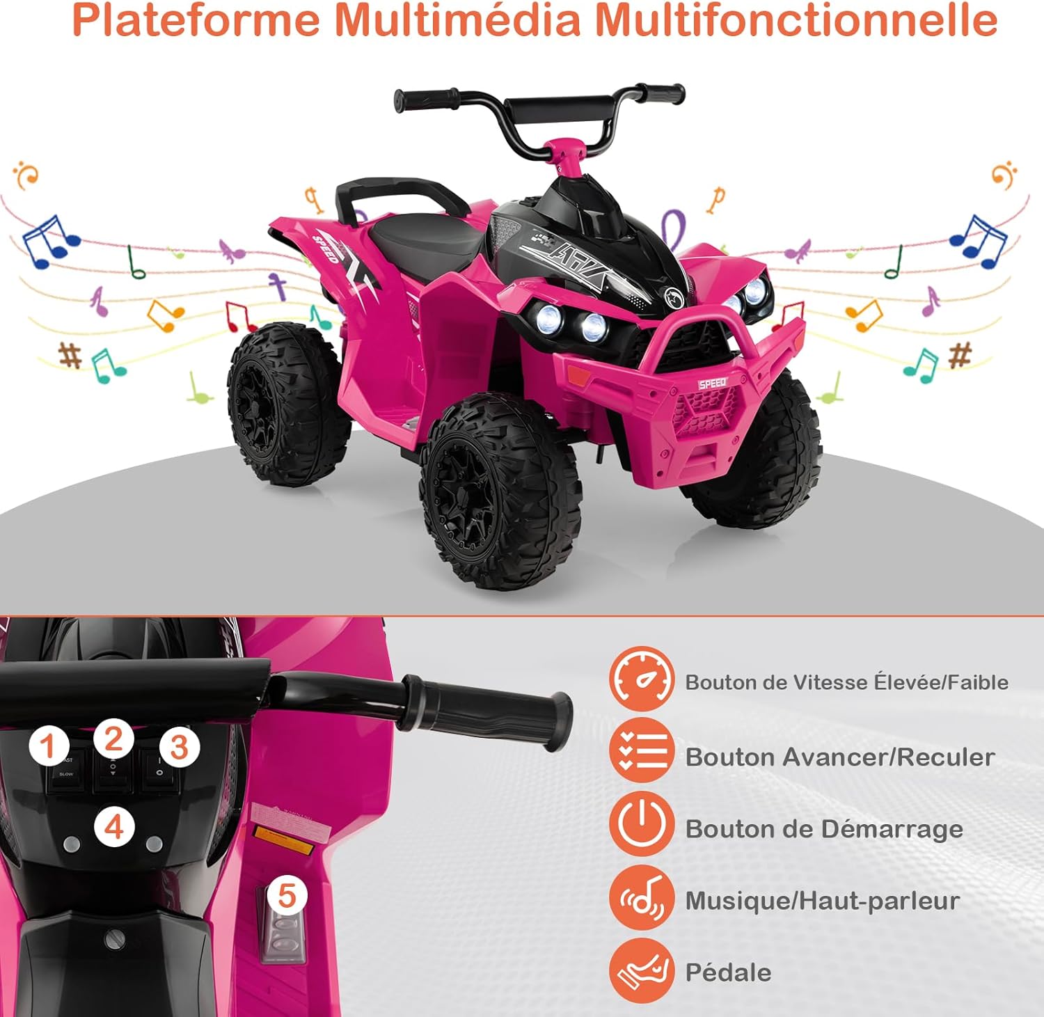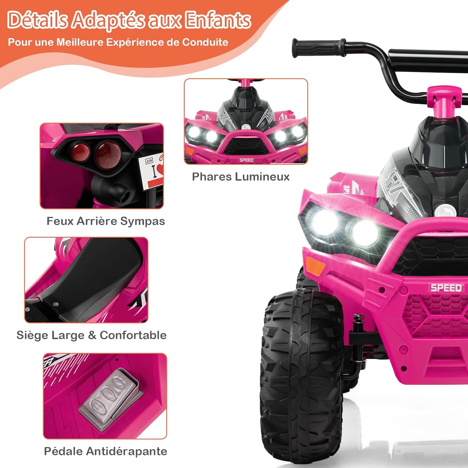 - Cadeau Parfait pour les Enfants : Adaptée aux enfants âgés de 3 à 8 ans, cette Voiture Tout Terrain pour enfants est une fantastique idée de cadeau pour les anniversaires et autres fêtes. Son apparence élégante ne manquera pas de conquérir le cœur des jeunes garçons et filles alors qu'ils explorent les bases de la conduite.Conçu pour offrir aux enfants âgés de 3 à 8 ans le plaisir d'une conduite réaliste, ce véhicule jouet propose 2 vitesses, des commandes intuitives et des extras divertissants comme de la musique et des lumières LED. Ses pneus à sculptures profondes assurent une navigation fluide sur presque tous les terrains. Pour des conduites sûres et confortables, ce quad est équipé d'un siège large et d'une pédale antidérapante. La poignée arrière permet aux parents de le transporter facilement. Surprenez votre tout-petit avec ce cadeau exceptionnel et préparez-le à une aventure palpitante.