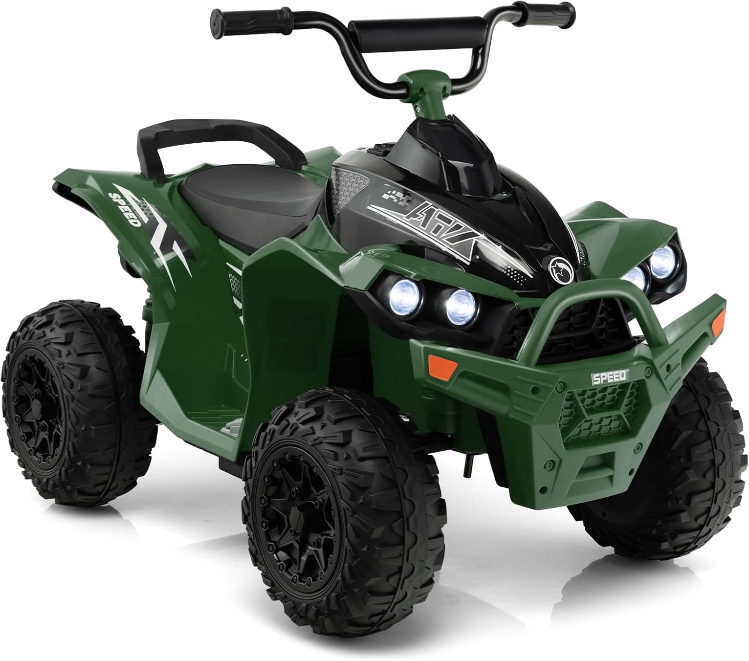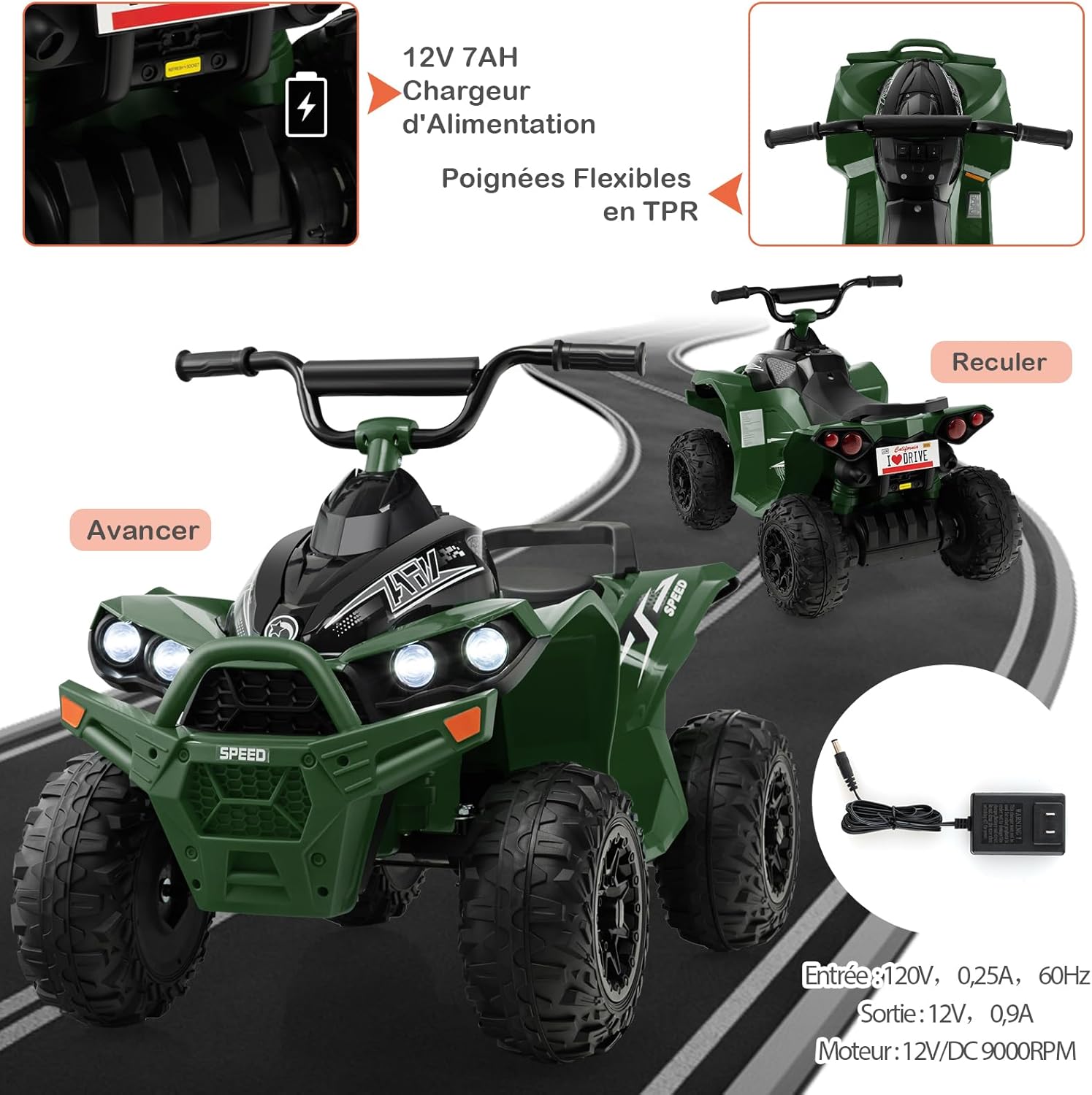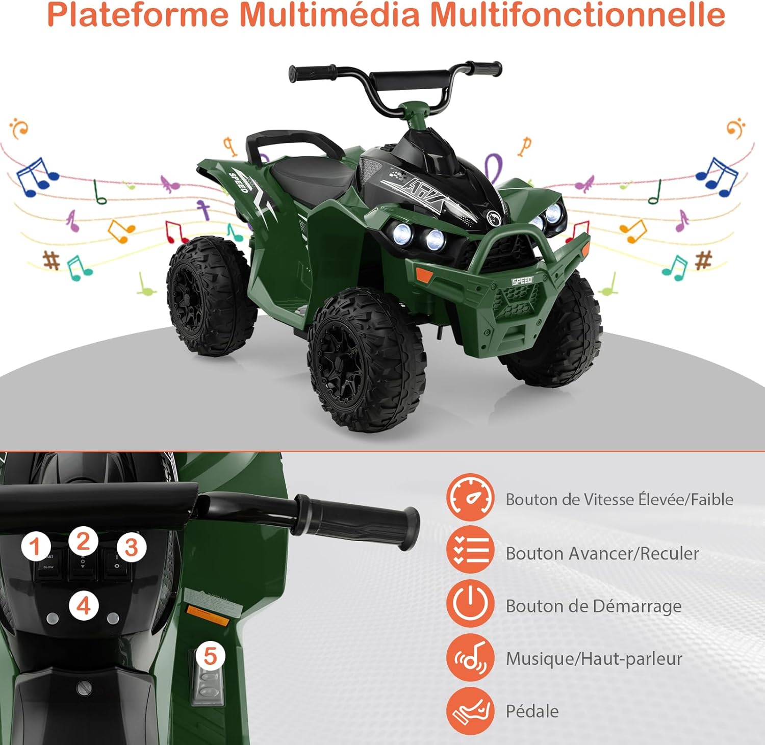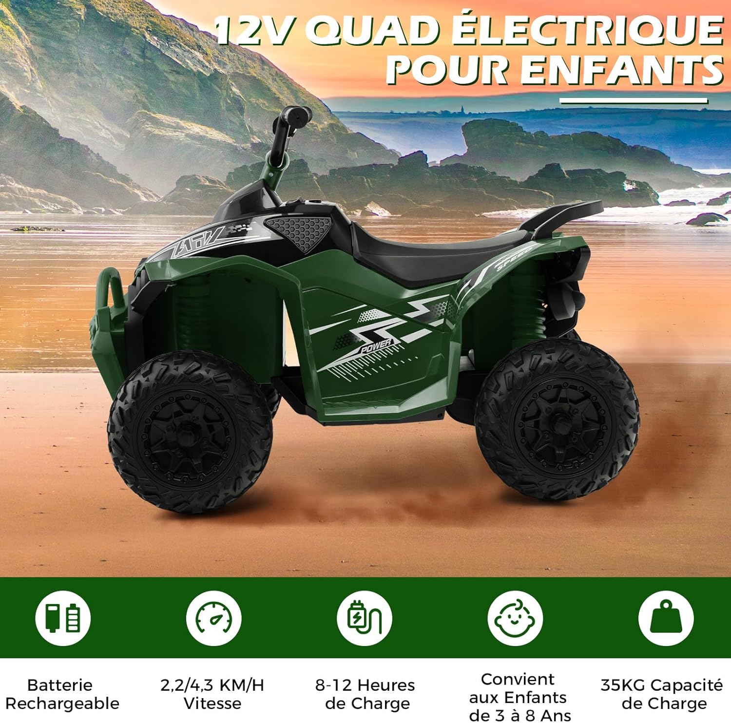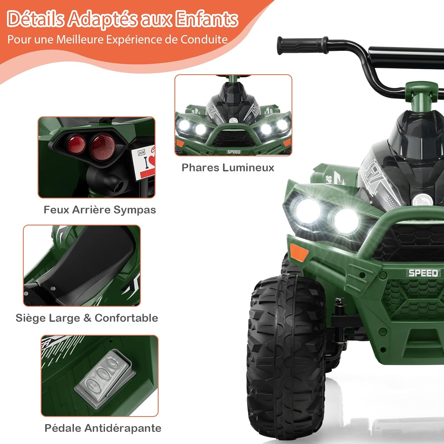 Voiture electrique enfants 12v, quad electrique 1 place 2,2-4,3 km/he, klaxon, musique, phares led,vert