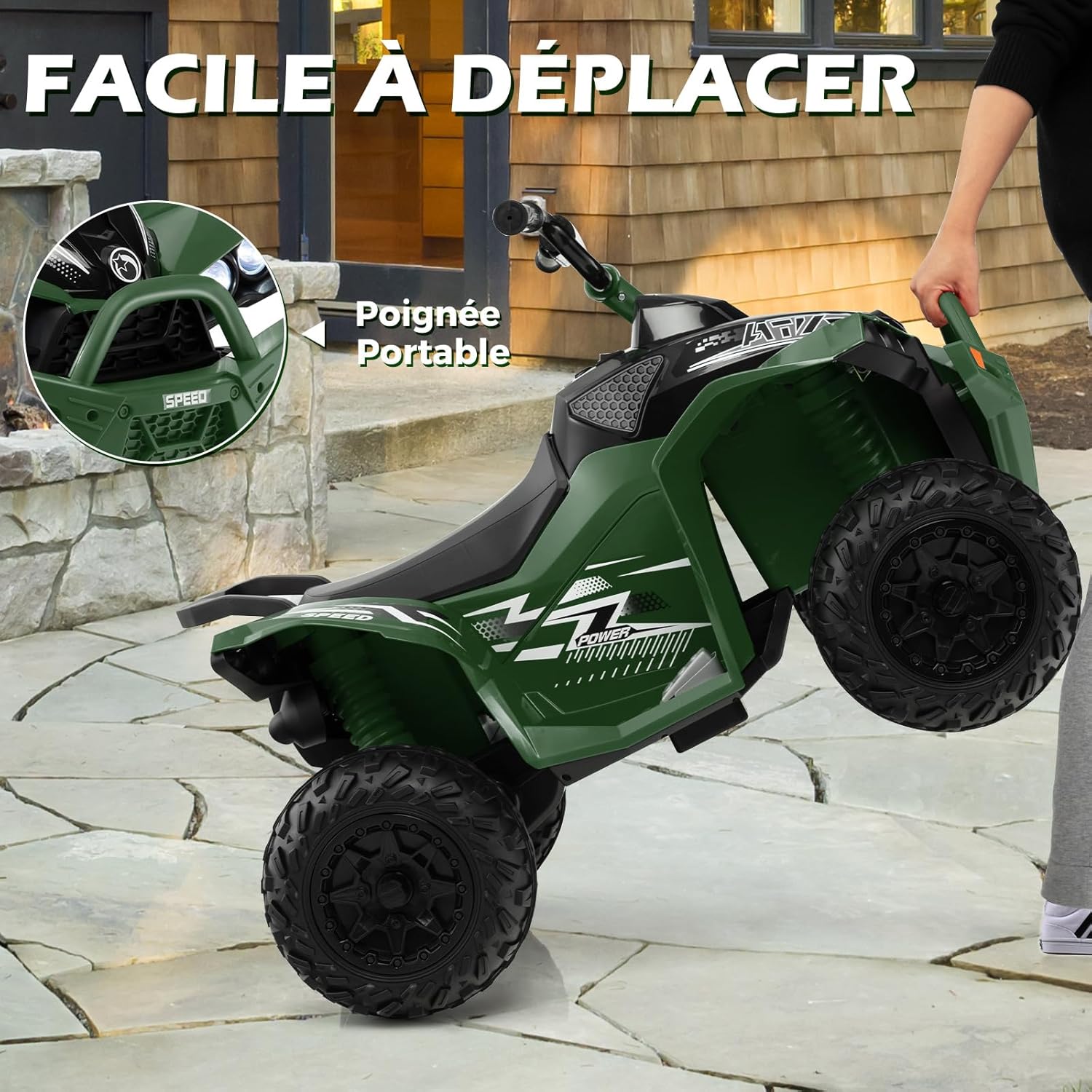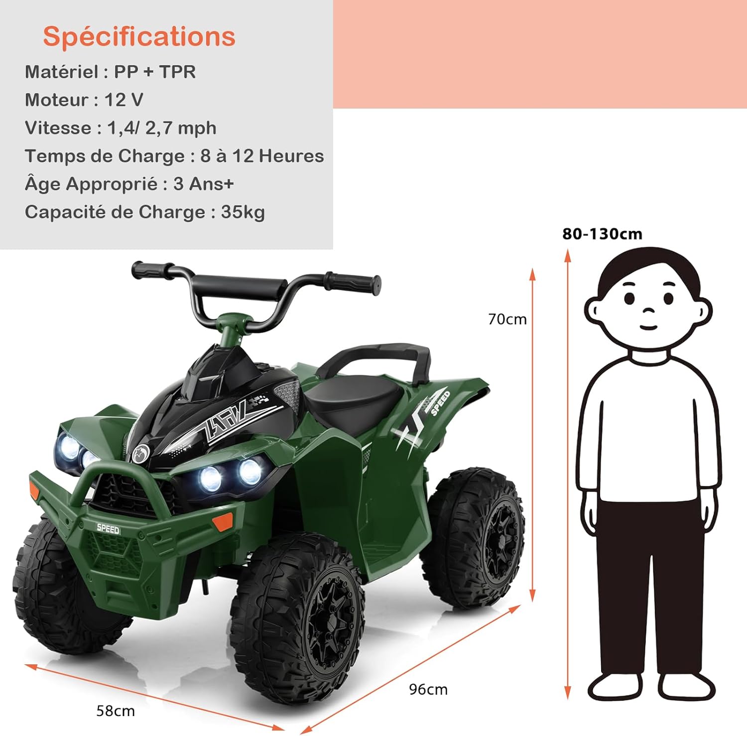 | Libellé | Voiture electrique enfants 12v, quad electrique 1 place 2,2-4,3 km/he, klaxon, musique, phares led,vert |