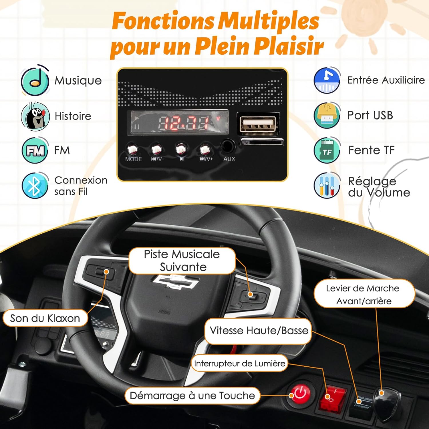 - Lecteur de Musique Amusant : Équipé d'un lecteur multimédia polyvalent offrant des chansons dynamiques, des histoires captivantes et la radio FM. Inclut une entrée aux, un port USB, un emplacement pour carte TF et une connexion sans fil avancée pour que les enfants puissent profiter de leurs sources multimédia préférées pendant le trajet.