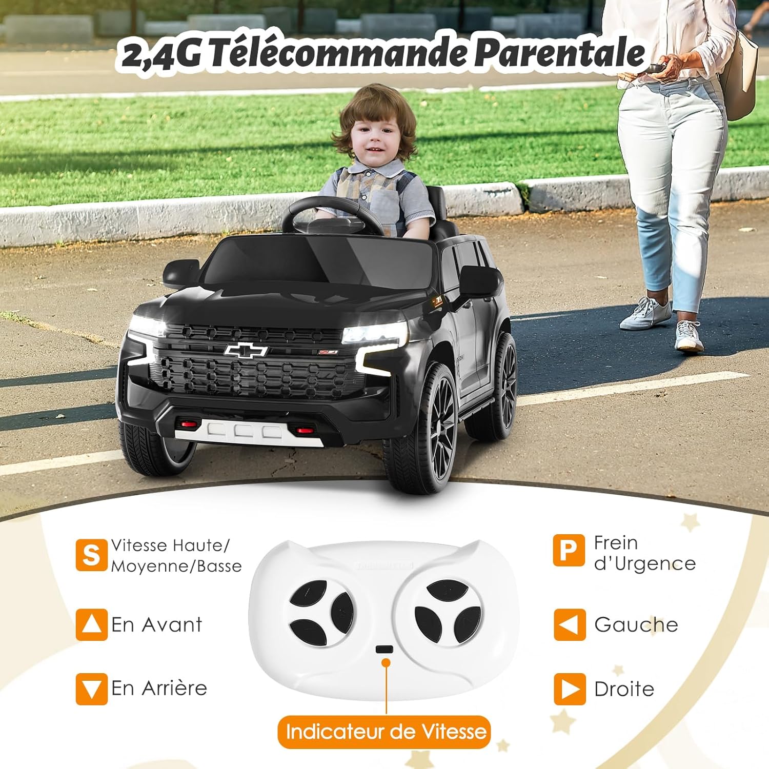 | Libellé | Voiture electrique enfants 12v, suv chevrolet tahoe pour enfants de 3-8ans avec télécommande 2,4 g,noir |