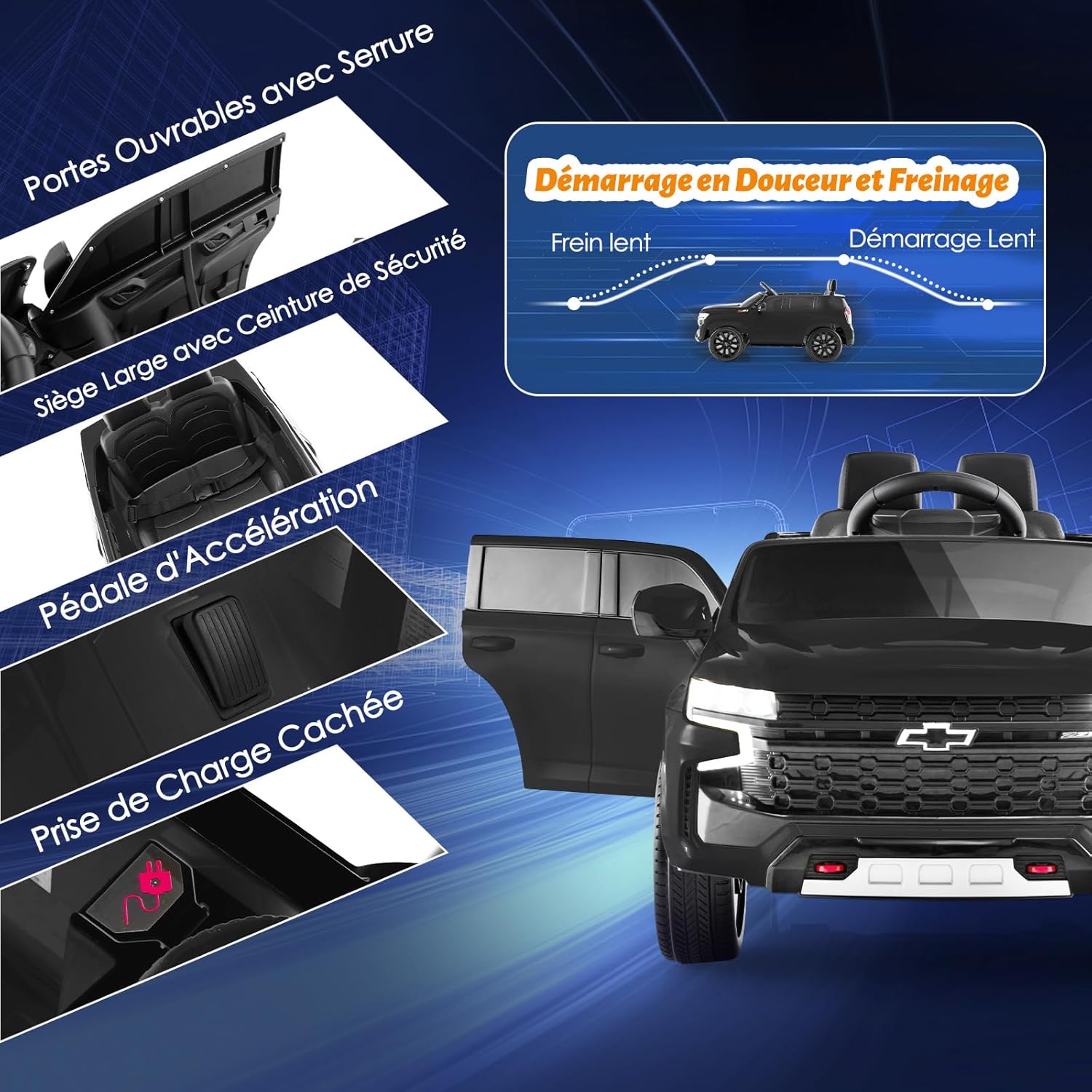 - Performance Élevée : Alimentée par 2 moteurs robustes de 35 W, cette voiture électrique atteint des vitesses élevées. Ses 4 roues résistantes à l'usure avec suspensions à ressort assurent une conduite en douceur sur divers terrains. La batterie rechargeable 12 V offre un temps de jeu prolongé pour un divertissement sans fin.Embarquez pour une aventure passionnante avec notre voiture électrique pour enfants 12 V, soigneusement conçue pour la sécurité et l'excitation. Fabriquée en PP durable et métal robuste, cette voiture assure la sécurité de votre enfant. Le design impressionnant du SUV Chevrolet Tahoe imite un véritable véhicule de luxe, avec des phares fonctionnels, des feux arrière et un tableau de bord lumineux captivant qui ravira les jeunes conducteurs. Les parents peuvent guider leur petit facilement avec la télécommande 2,4 G dotée de 3 vitesses variables, accompagnée du bouton de démarrage, de la pédale d'accélérateur et du volant pour une expérience de conduite réaliste