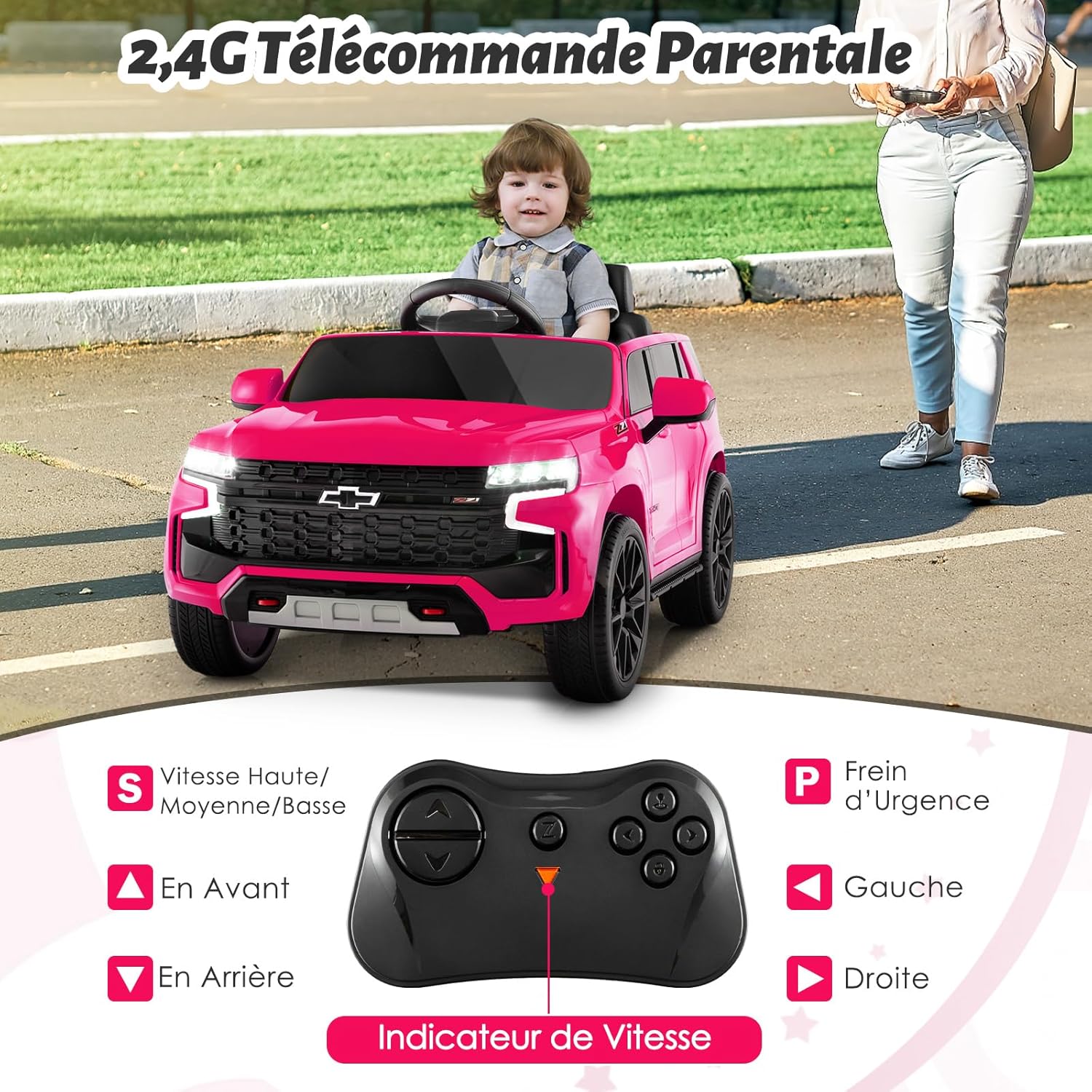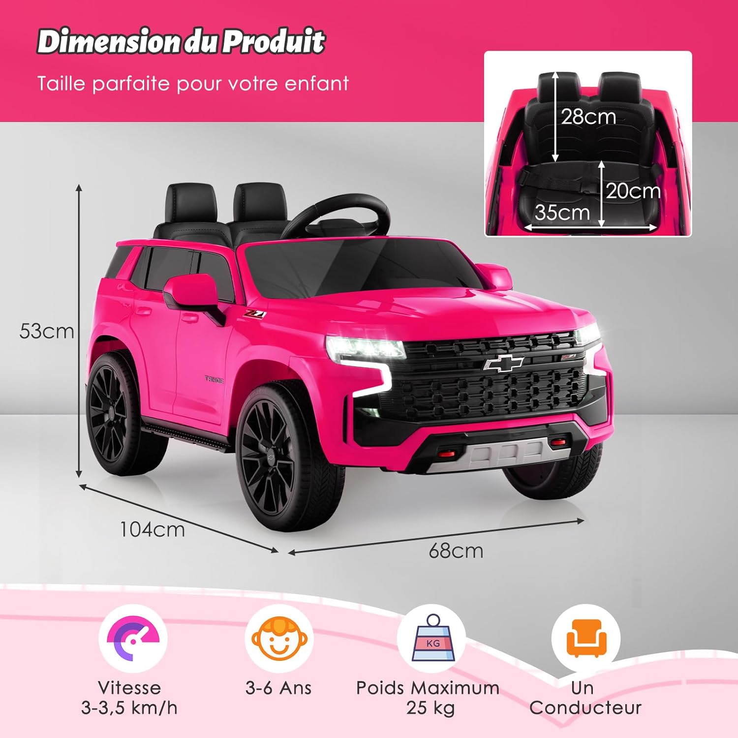 | Libellé | Voiture electrique enfants 12v, suv chevrolet tahoe pour enfants de 3-8ans avec télécommande 2,4 g,rose |