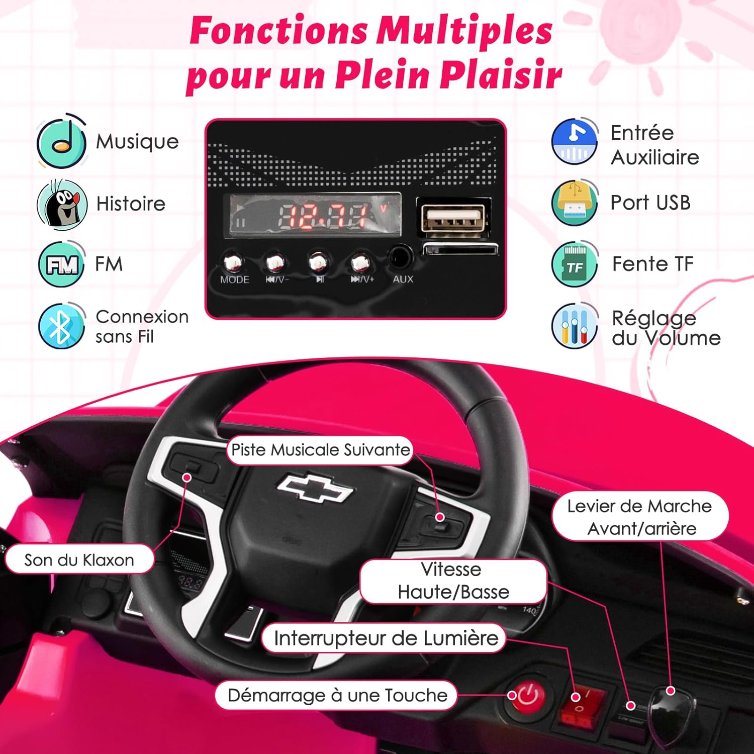 - Lecteur de Musique Amusant : Équipé d'un lecteur multimédia polyvalent offrant des chansons dynamiques, des histoires captivantes et la radio FM. Inclut une entrée aux, un port USB, un emplacement pour carte TF et une connexion sans fil avancée pour que les enfants puissent profiter de leurs sources multimédia préférées pendant le trajet.