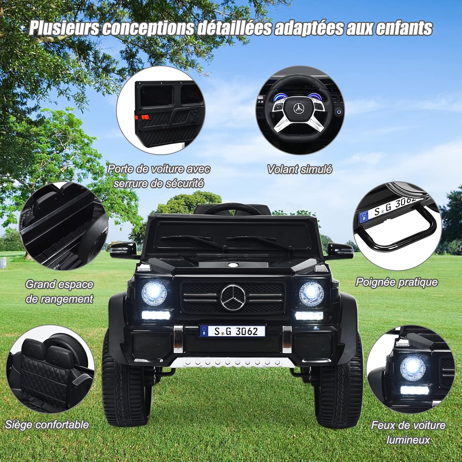 • Matériau solide et durable : Cette voiture est faite de fer robuste et de matériaux plastiques de haute qualité qui garantissent une structure robuste et une grande portée. La surface et les roues sont résistantes à l'usure et aux agents atmosphériques pour offrir une utilisation durable et sont très faciles à nettoyer.Deux petites voitures électriques autoportées noires pour enfants, ressemblant à des VUS. Une voiture montrée avec un enfant au volant sur une zone gazonnée.Petite voiture électrique autoportée pour enfant ressemblant à une Mercedes-Benz Classe G, avec un adulte utilisant une télécommande à proximité dans unprésentant les caractéristiques d'un jouet ou d'une maquette de voiture, notamment des lumières LED, des roues épaisses adaptées à différents terrains et des vues avant et arrièreSpécifications d'une petite voiture, y compris les dimensions, le poids et les informations relatives à la batterie. Image d'une petite voiture noire de style Mercedes Classe G visible.Image à quatre panneaux présentant les caractéristiques de l'intérieur de la voiture : sièges en cuir, console centrale, volant avec affichage numérique et levier de vitesses