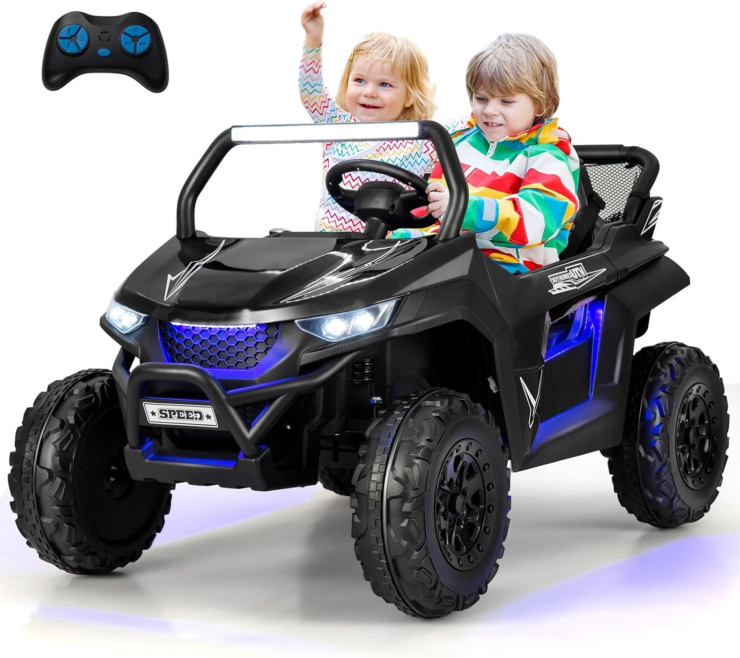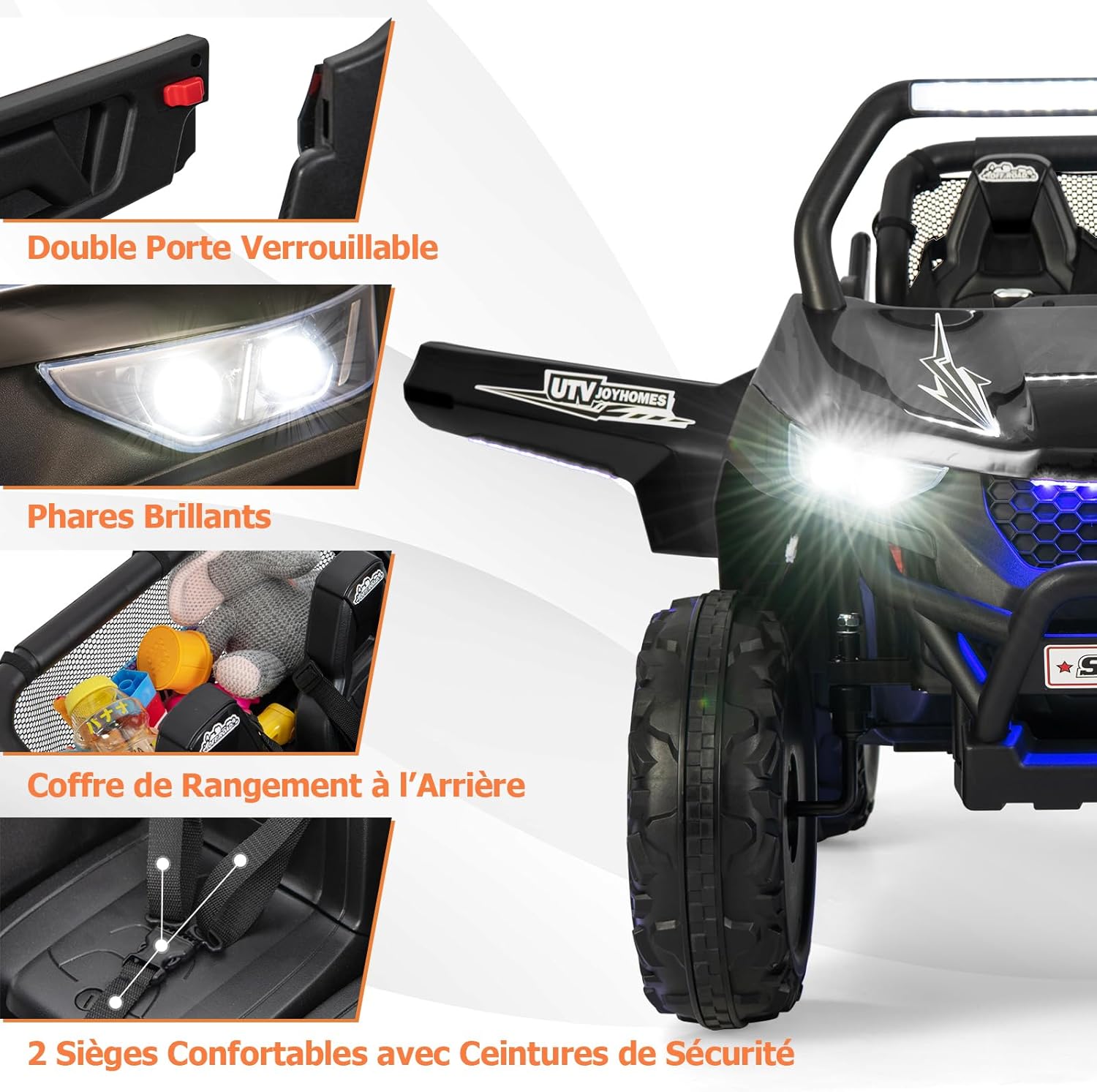 Voiture electrique enfants 2 place avec télécommande 2,4g, lumières et musique, quad 4x4 electrique noir