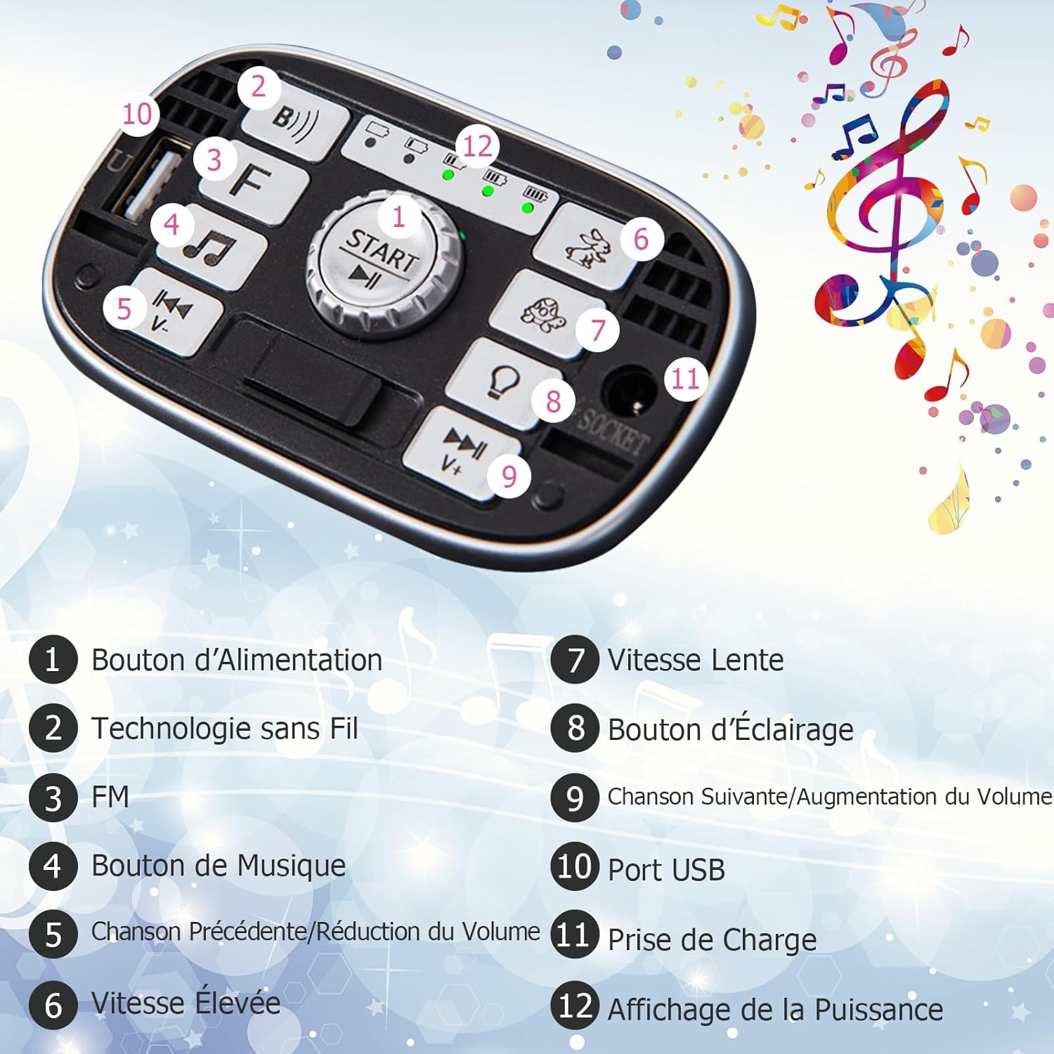 - Voiture électrique avec fonctions multiples : Non seulement les enfants peuvent profiter de la musique et écouter la radio tout en conduisant le véhicule électrique multifonctionnel, mais ils peuvent également contrôler facilement les lumières pour la conduite de nuit et l'ambiance. De plus, la véhicule pour enfants peut être facilement commandée en marche avant et arrière et est disponible en deux vitesses, haute et basse, selon les besoins.
