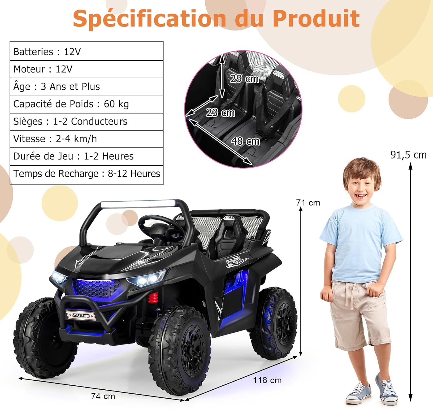 | Libellé | Voiture electrique enfants 2 place avec télécommande 2,4g, lumières et musique, quad 4x4 electrique noir |