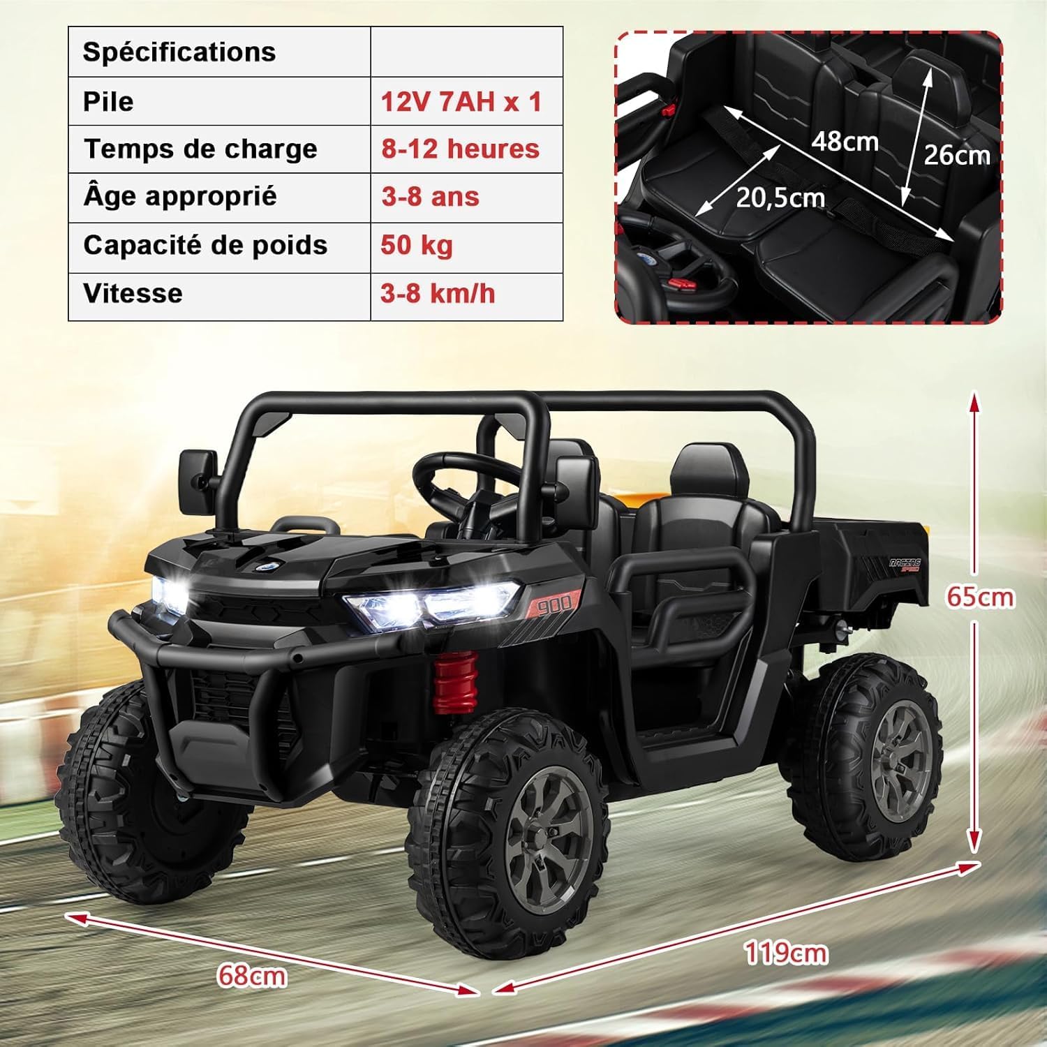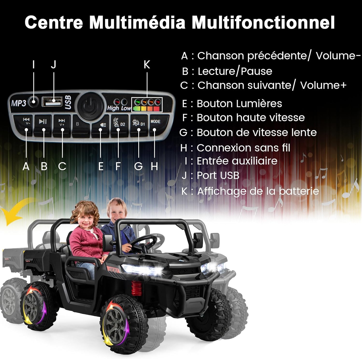| Libellé | Voiture electrique enfants 2 place avec télécommande 2,4g, tracteur electrique enfants 12v démarrage noir |
