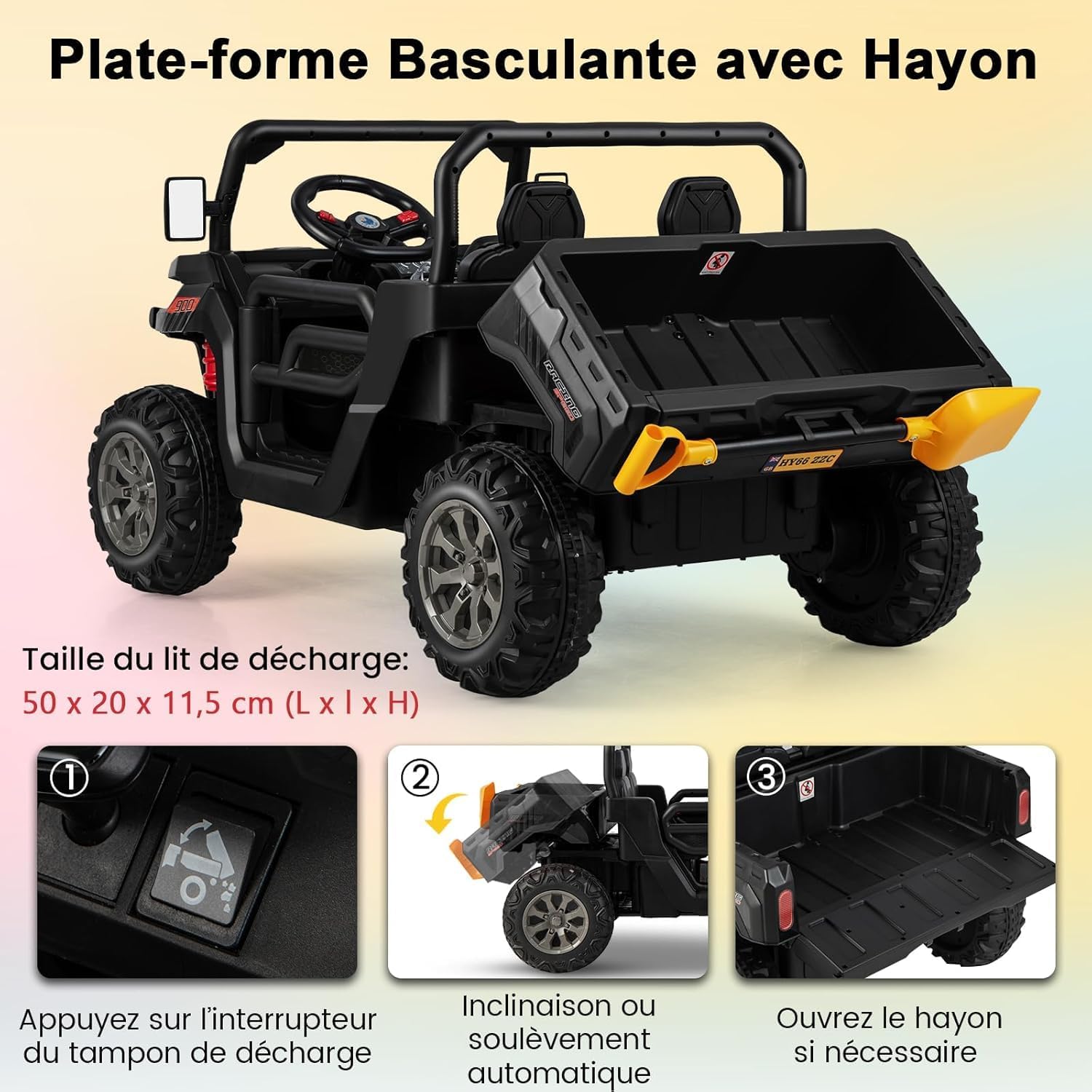 - Plusieurs divertissements : Avec des lumières vives, un rétroviseur, un volant avec klaxon et des musiques intégrées, ce camion à benne basculante est destiné à offrir à votre enfant une expérience de conduite réaliste et amusante. En outre, il est équipé d'un port USB et d'un port MP3 permettant de connecter des appareils de musique externes pour écouter les musiques et les histoires préférées des enfants.