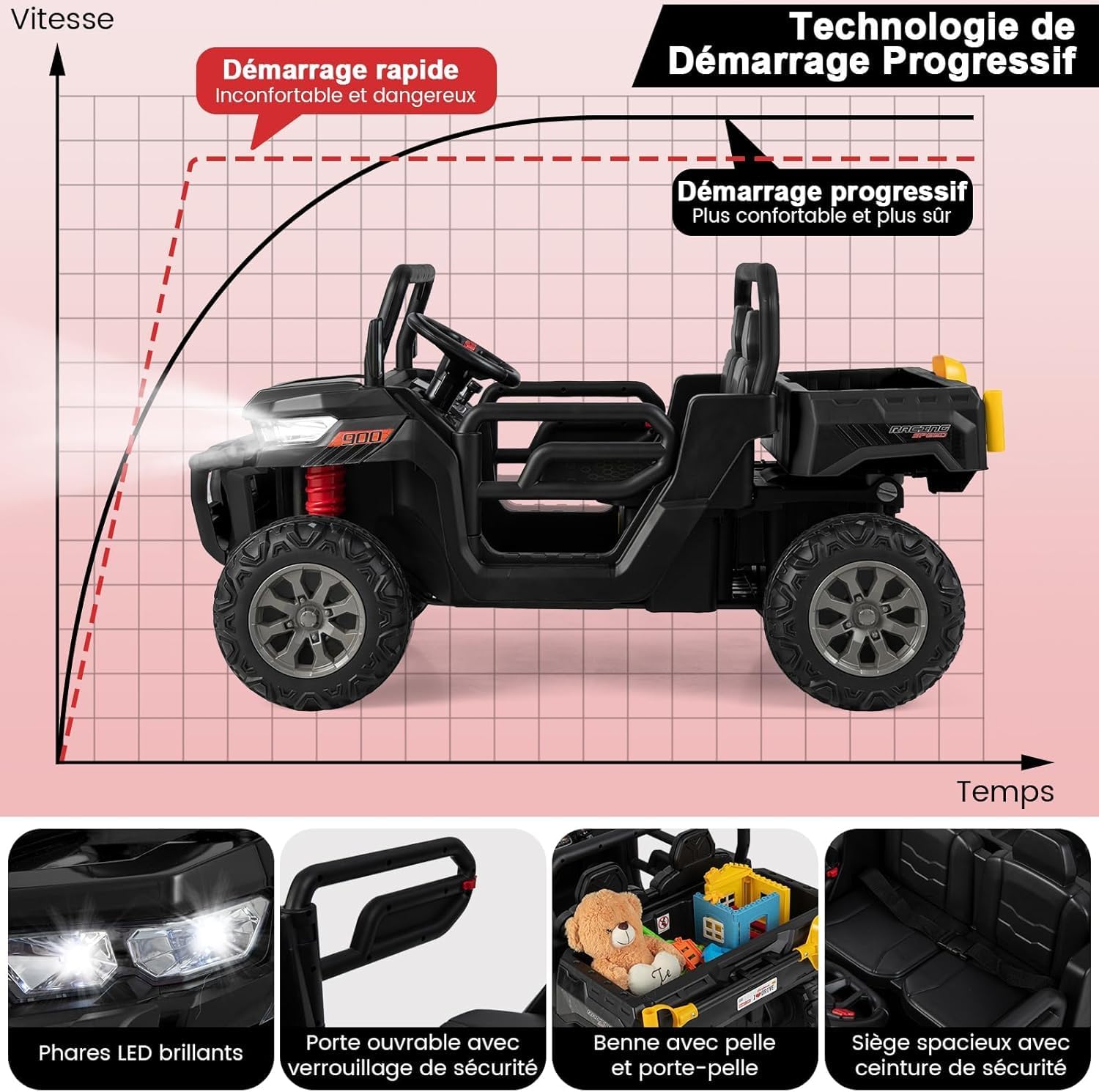 - Conduite sûre et confortable : La sécurité de votre enfant étant notre priorité, une technologie de démarrage lent est conçue pour protéger la sécurité de vos enfants pendant la conduite et les empêcher d'être effrayés par le démarrage rapide. En outre, le siège large avec ceinture de sécurité offre une position de conduite confortable et sûre pour les enfants.