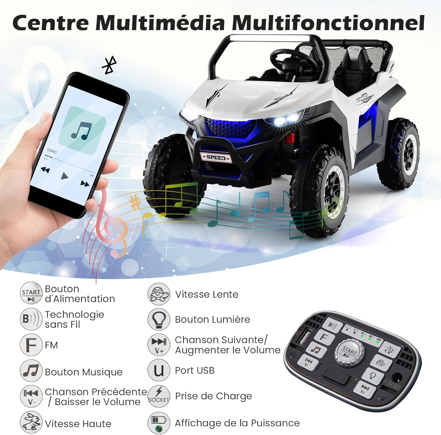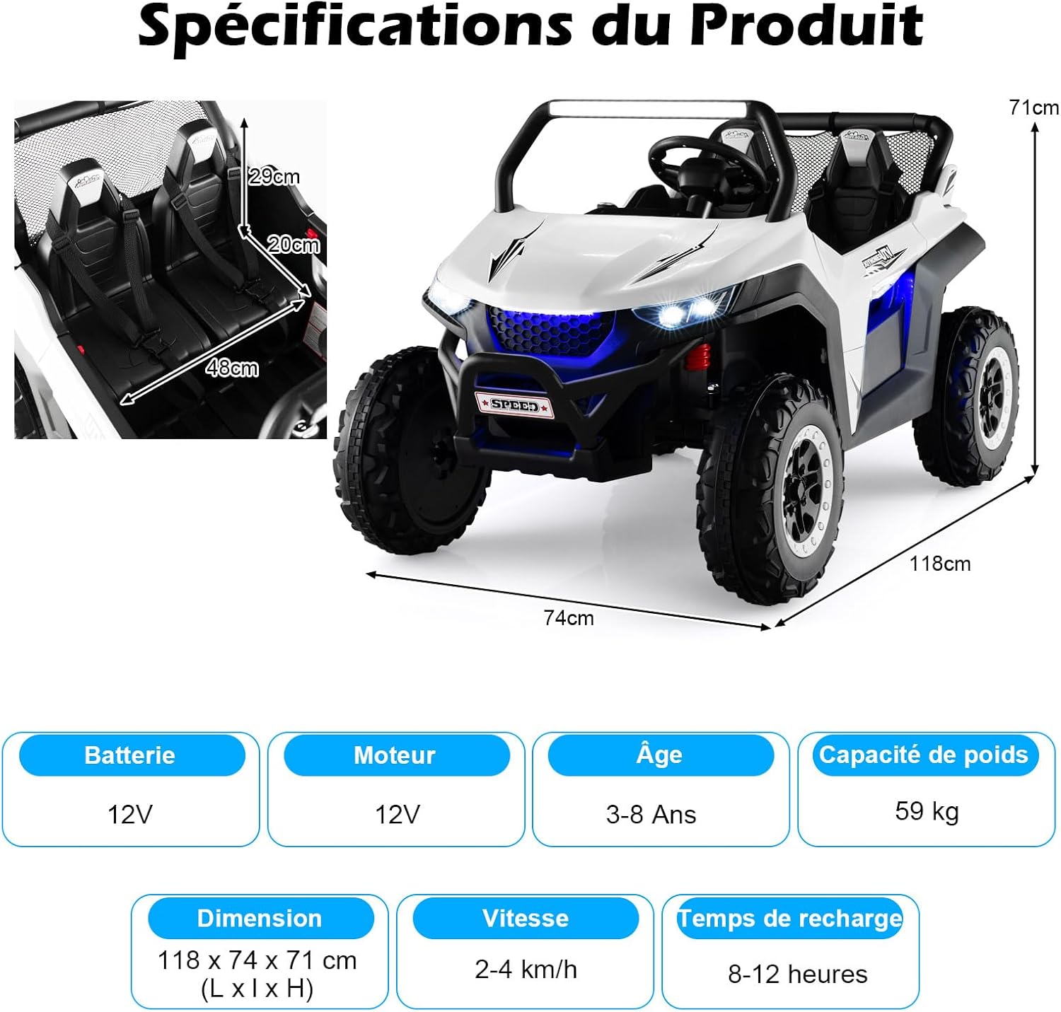 | Libellé | Voiture electrique enfants 2 place télécommande 2,4g lumières musique quad 4x4 electrique enfants blanc |