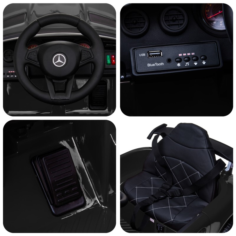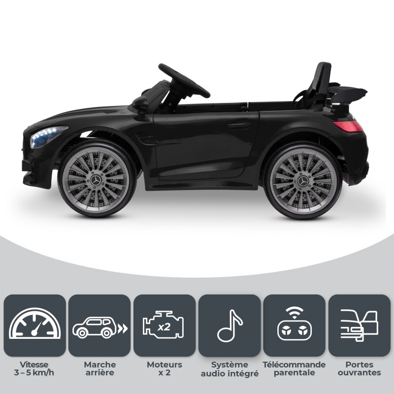 La Mercedes est équipée d'une pédale d'accélérateur, est capable de rouler en marche arrière et dispose également de portes ouvrables, d'un indicateur de batterie et de phares fonctionnels. Son système audio qui fonctionne par prise USB ou Jack et ses musiques pré-enregistrées amuseront votre enfant lors de ses promenades.