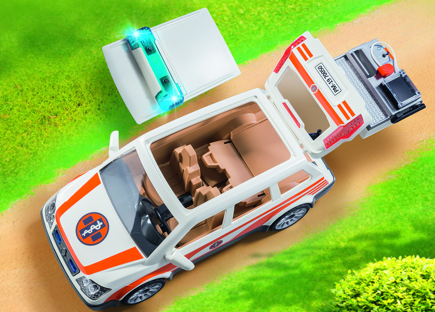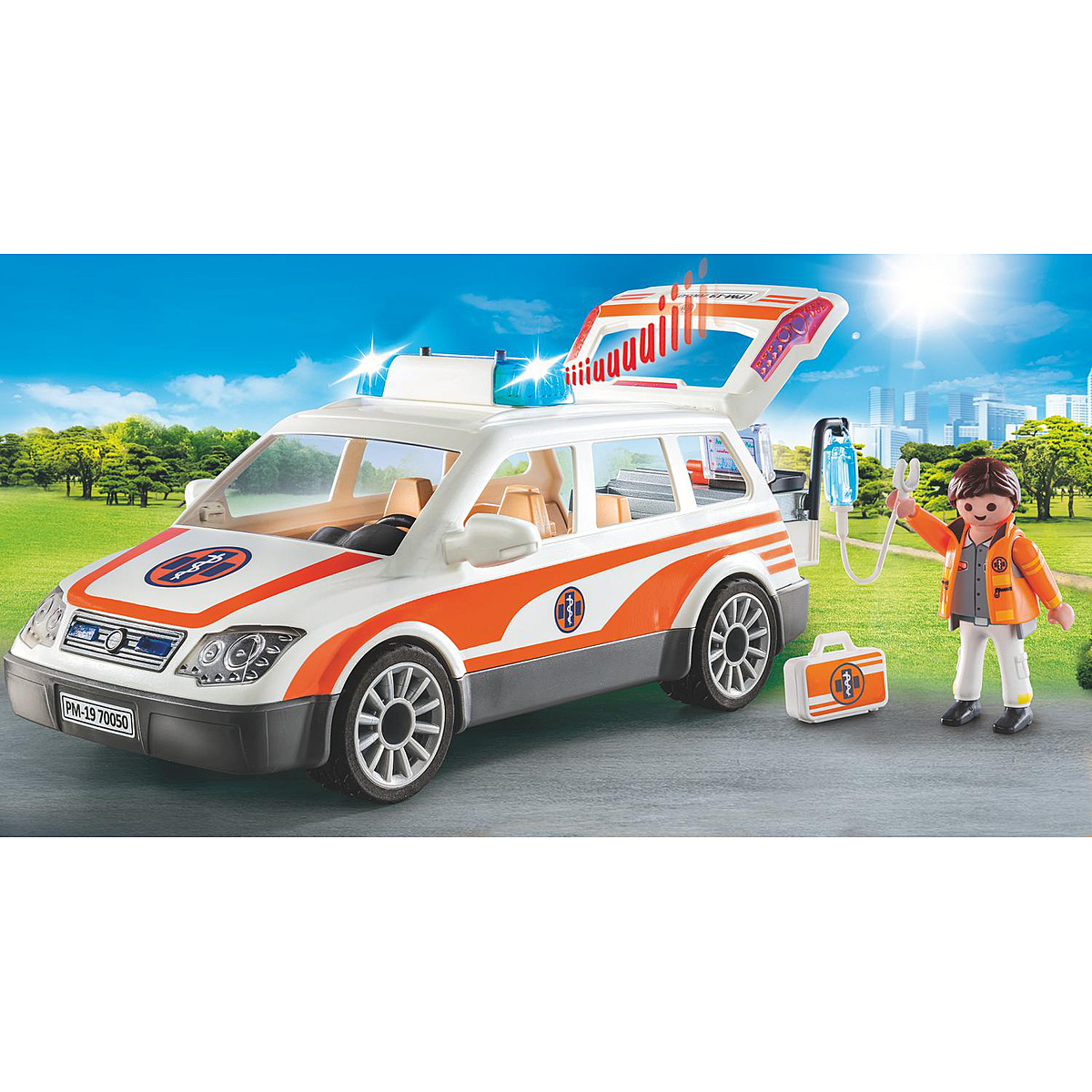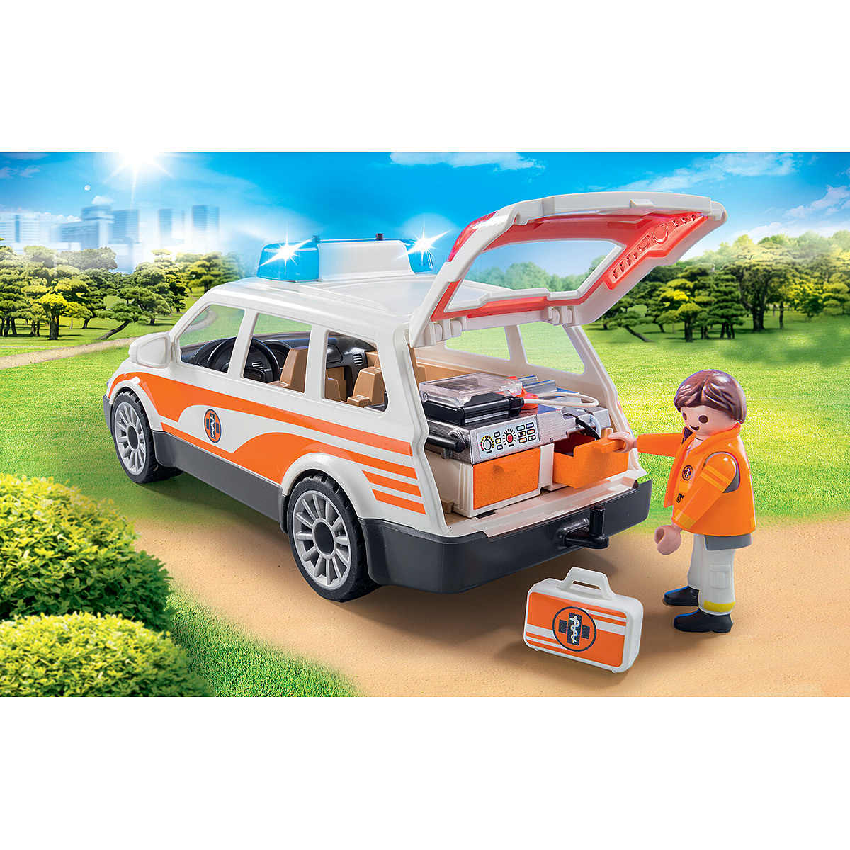 Vite ! Laissez la voiture de l'ambulancier passer. Avec un équipement pour médecin urgentiste dans le coffre. Le gyrophare est fonctionnel : effets lumineux et sonores (nécessite une pile AAA 1,5 V non fournie).