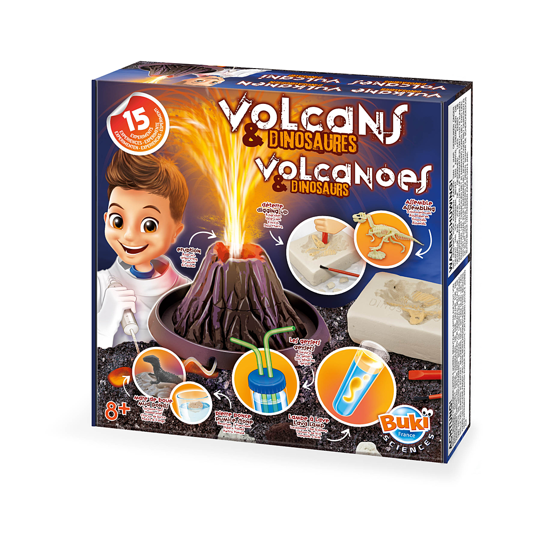 Découvre 15 expériences sur les volcans et les dinosaures : reproduis une éruption volcanique à la maison, observe les roches volcaniques, réalise une lampe à lave et déterre un squelette de Tyrannosaure à assembler. Notice illustrée en couleurs. Dès 8 ans.