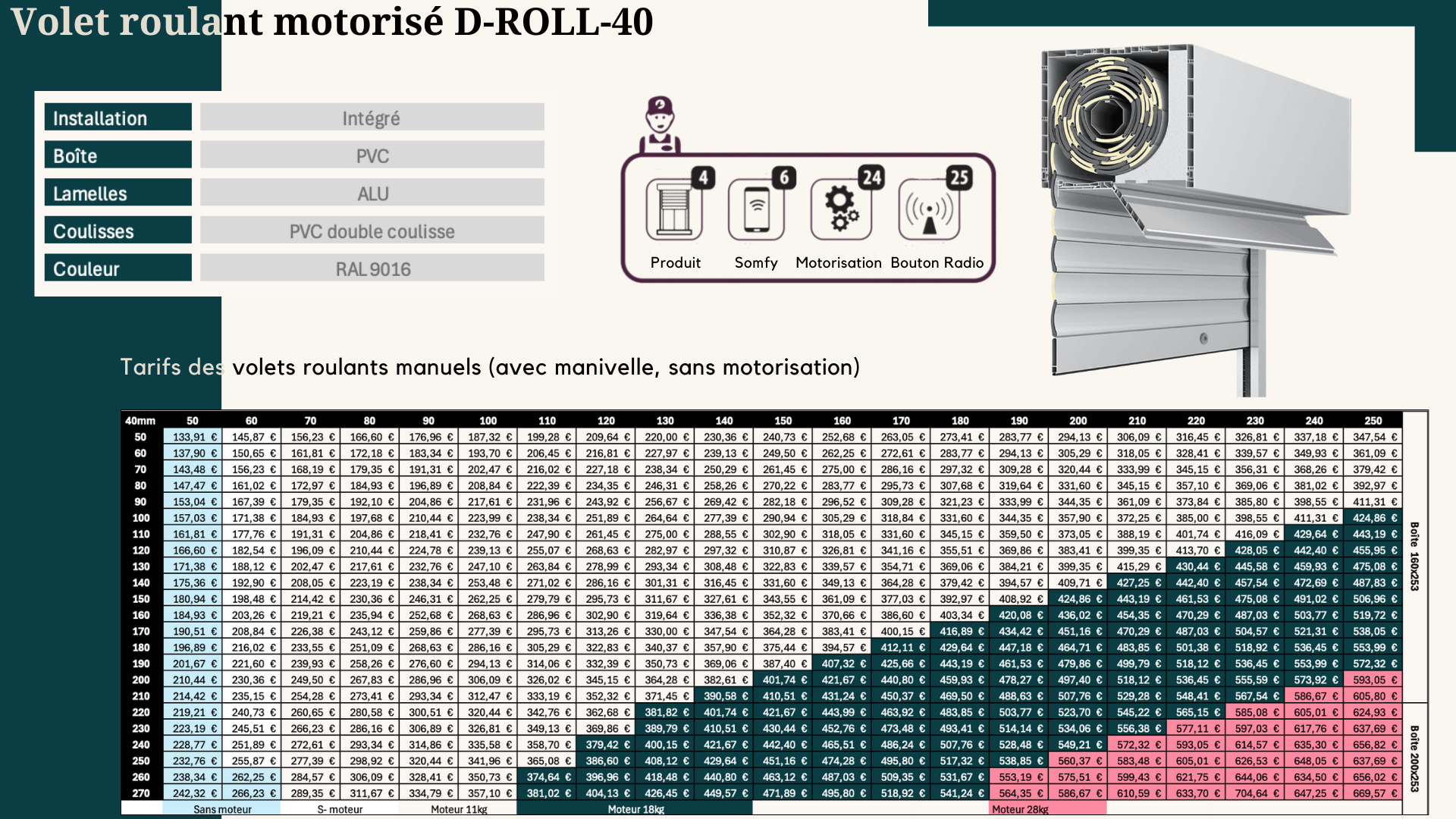 | Libellé | Volet roulant motorisé D-ROLL-40 RAL 9016 Solus - Filaire (L.: 2000 mm x H.: 2150 mm) |