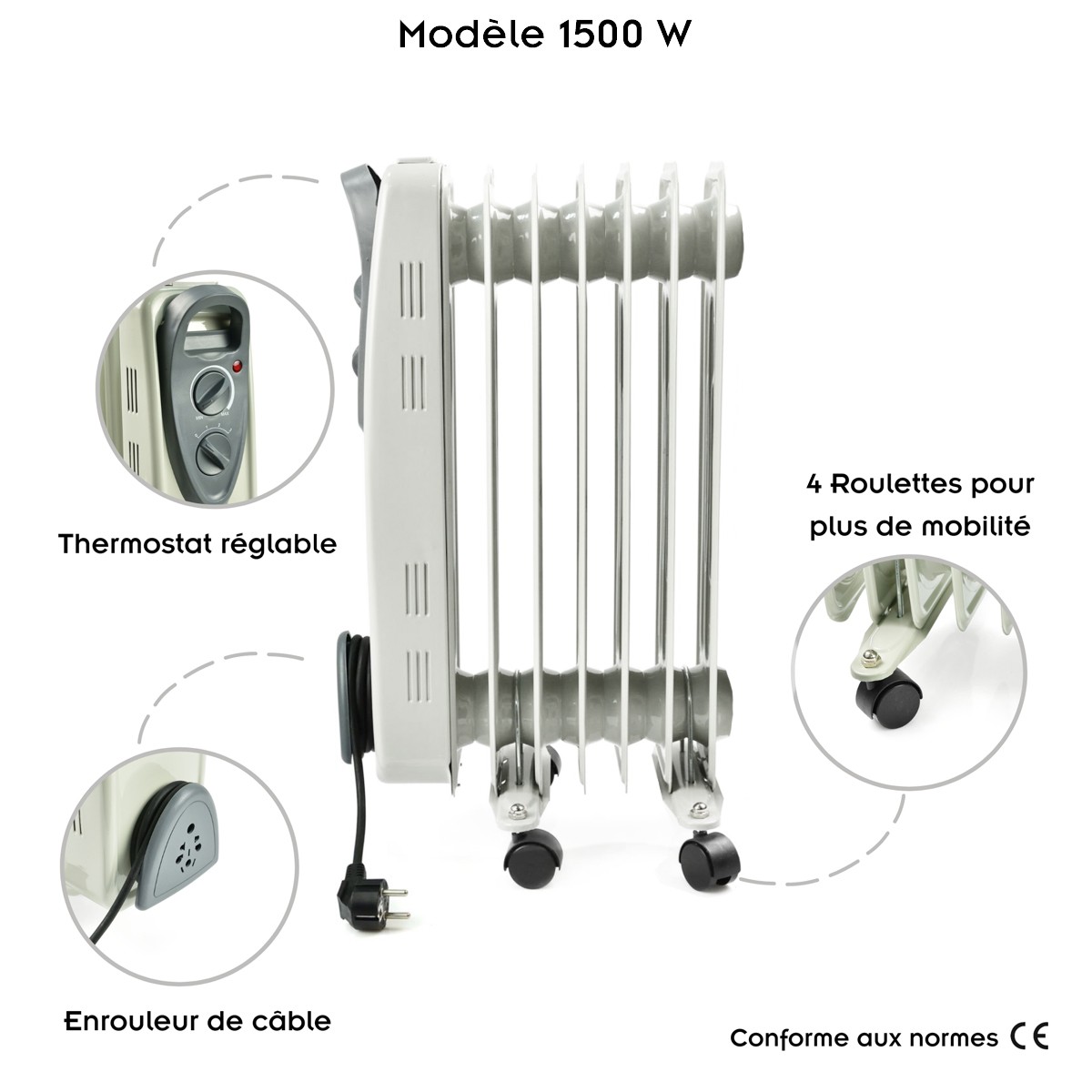 | Plus produit | Radiateur bain d'huile sur roulettes 7 éléments 1500 W ou 9 éléments 2000 W. |
