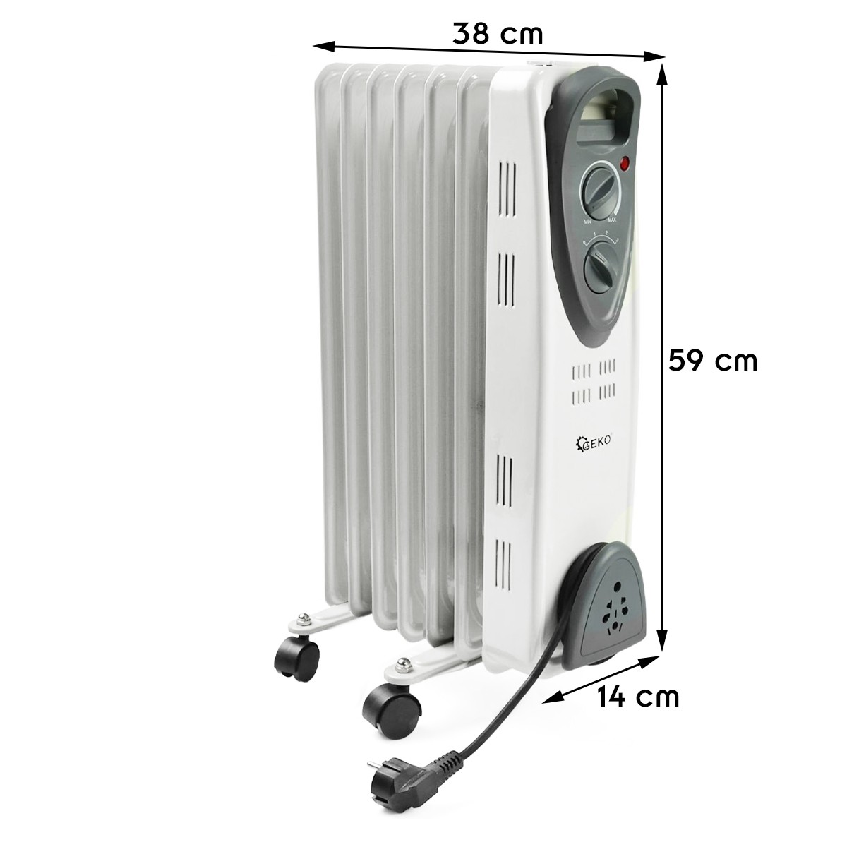 Modèle 1500 W : L 38 x l 14 x H 59 cm. Poids : 5,70 kg.