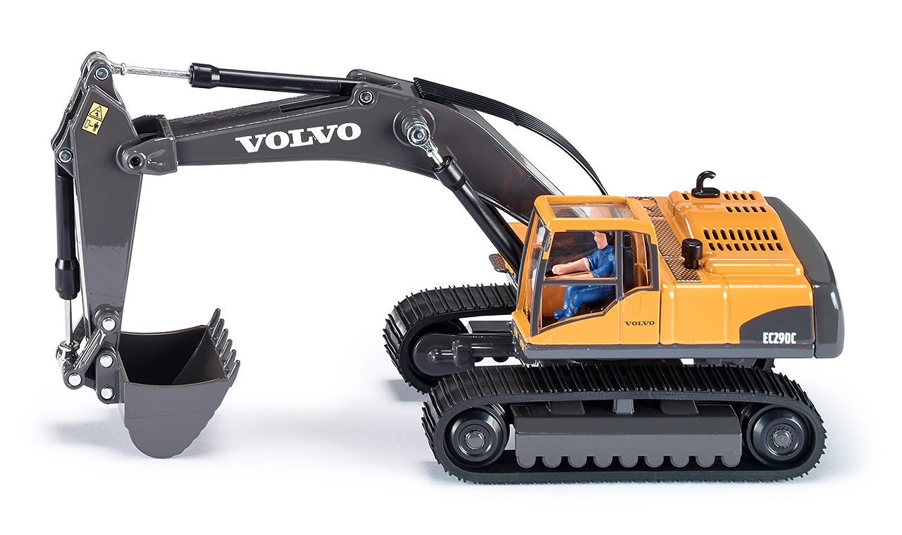 Cet excavateur hydraulique de la marque Volvo est un engin standard des petits et moyens chantiers. Le modèle principalement en métal à l'échelle 1:50 séduit par la grande précision de ses détails. Les chenilles en matériau caoutchouté sont mobiles. La tourelle avec cabine et flèche tourne sur 360°. Ce modèle permet de travailler de manière réaliste étant donné que la flèche et la pelle ont été conçues mobiles grâce à des articulations rotatives.