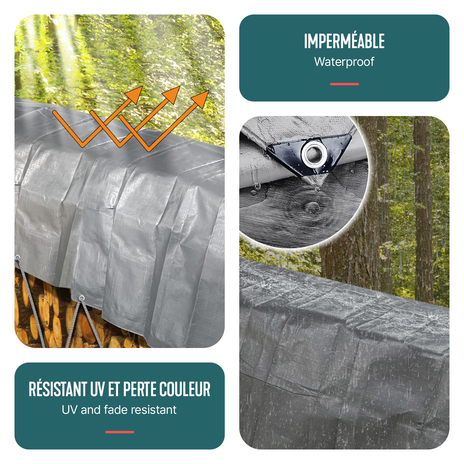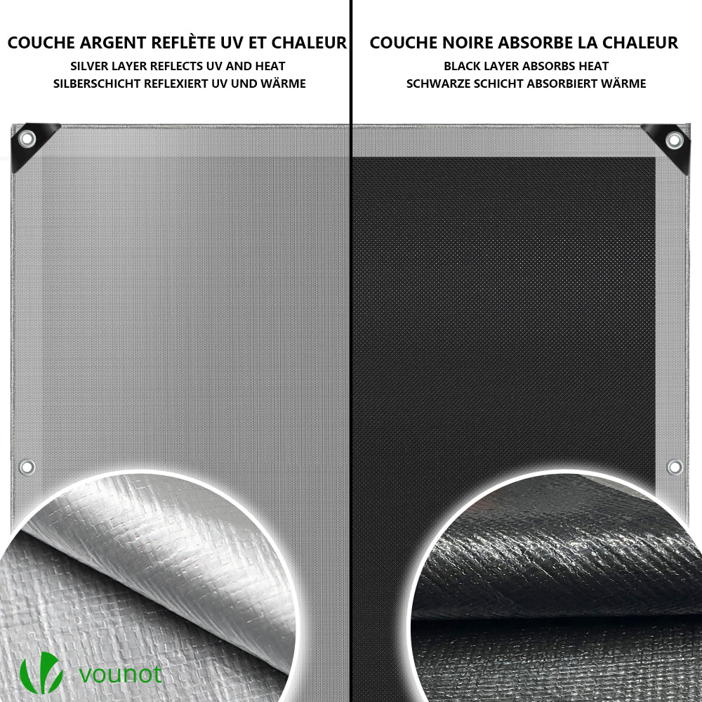 - Notre bâche de protection bicolore de couleur argentée et noire est réversible. Le coté argenté va refléter les UV et la chaleur tandis que la face noire va absorber la chaleur. Cela vous assure une protection adaptée et prolongée à l’extérieur contre les déchirures, le vent, la pluie, la neige, la poussière ou encore un fort ensoleillement.