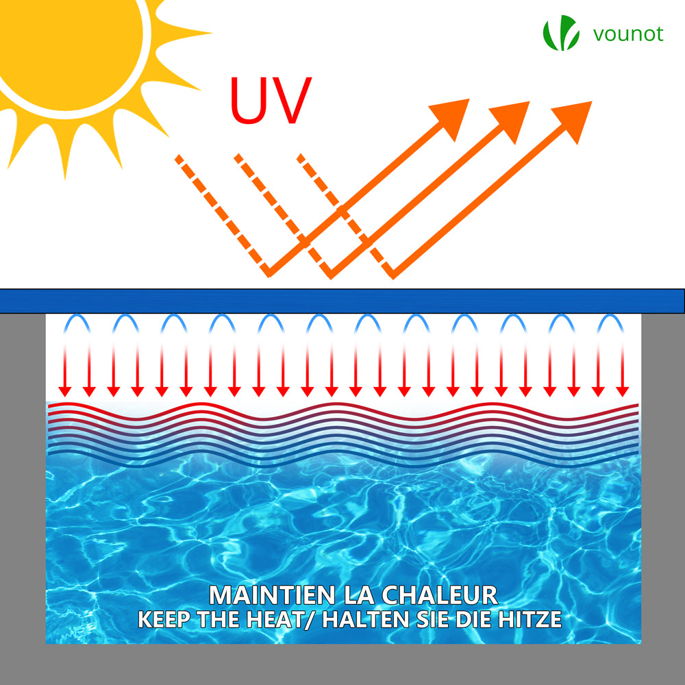 • Notre couverture de piscine possède une double épaisseur : une face bleue qui fait écran aux rayons UV du soleil, et une face argentée qui maintient la chaleur. Cette combinaison aide à maintenir la température de l'eau de la piscine à une température confortable, particulièrement lors des nuits plus fraîches.
