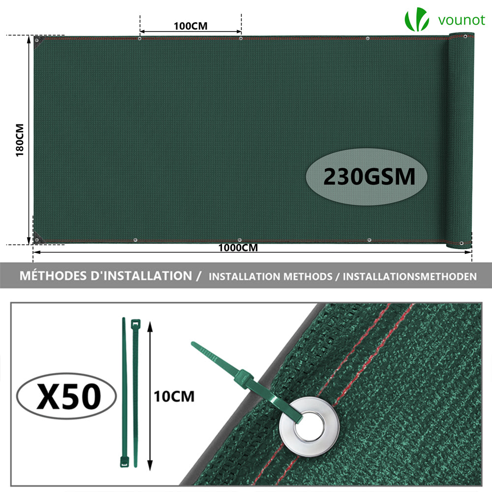 | Libellé | VOUNOT Brise vue occultant en HDPE 230g/m² 1.8x10m avec attaches de fixation vert |