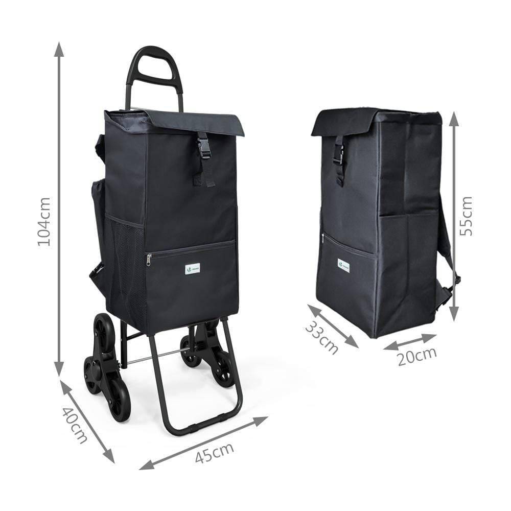 - Le caddie comprend un sac de 40L isotherme vous permettant de mettre plus de 30kg de produits frais. De plus, il possède 3 pochettes de rangement et se transforme en sac à dos !