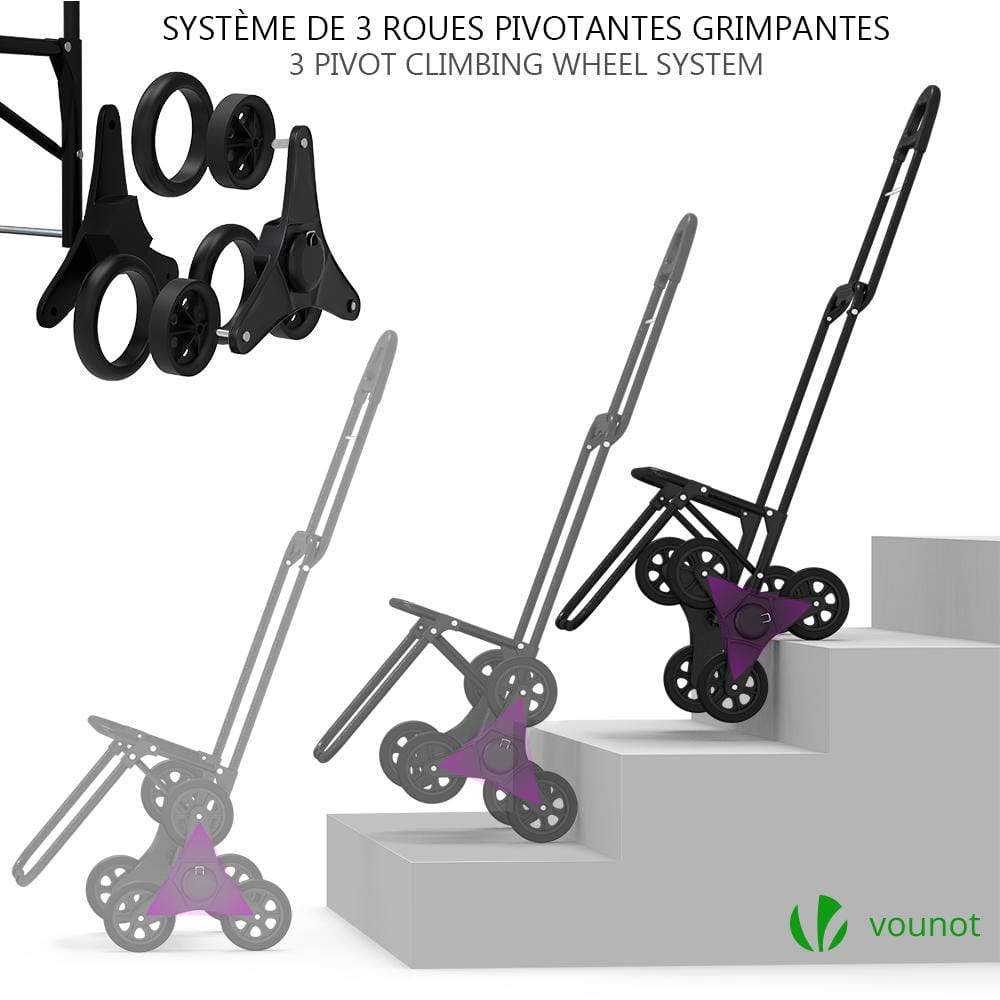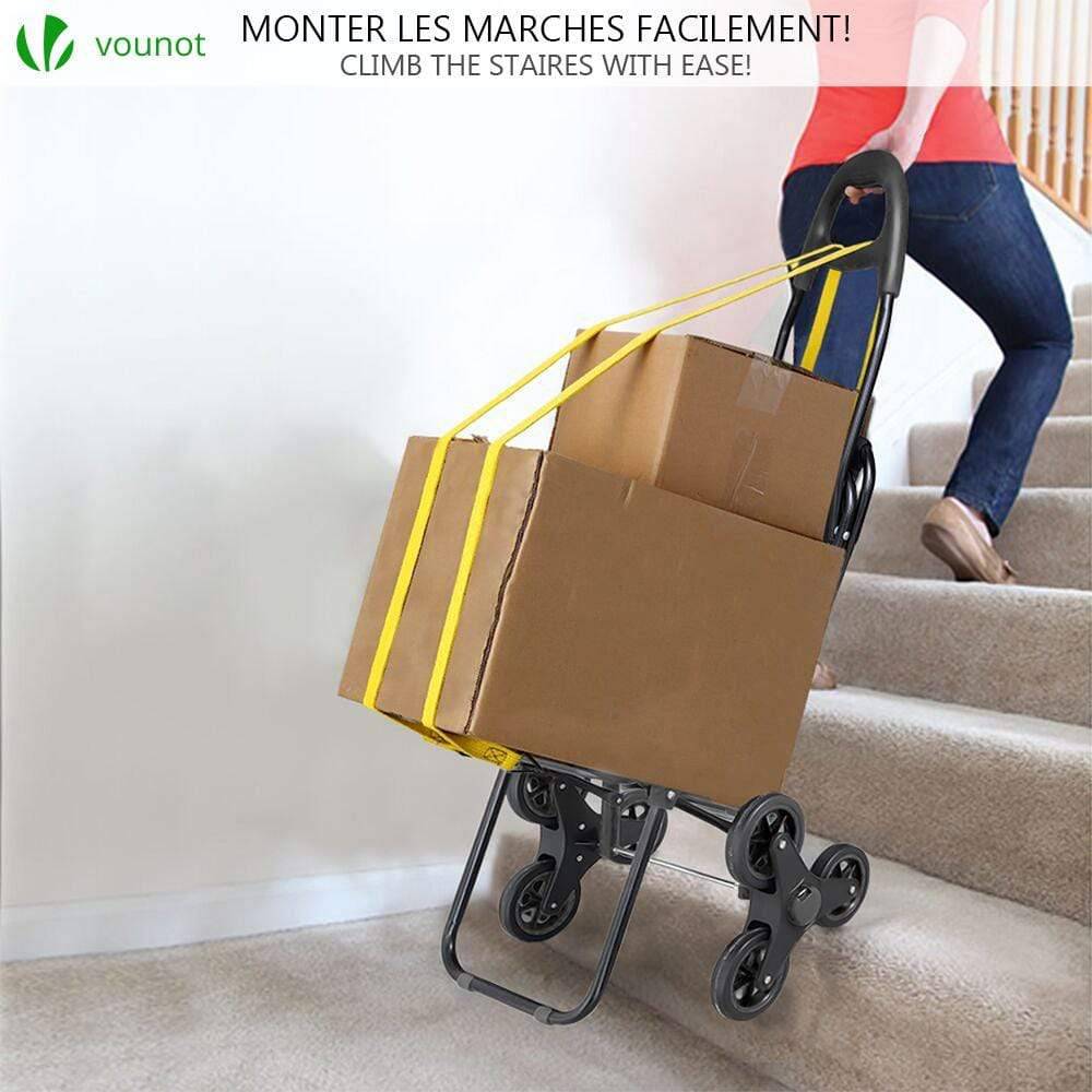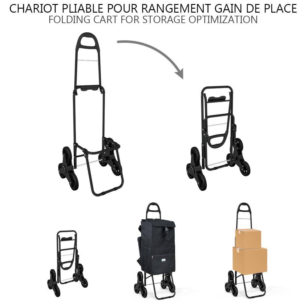 - Le chariot de course à un système de 6 roues qui vous permet de monter ou de descendre les escaliers sans difficulté.