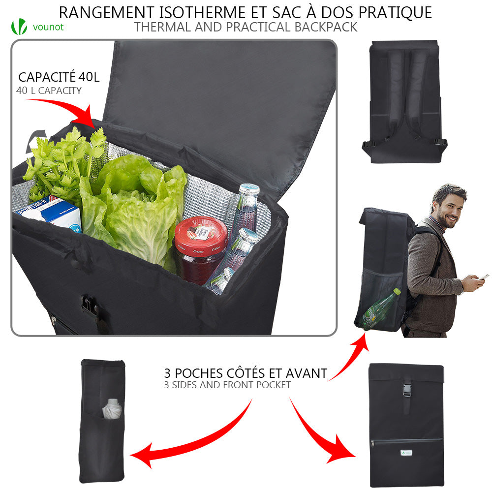 - Le chariot a un grand sac de rangement isotherme de 40L pour préserver vos produits frais.