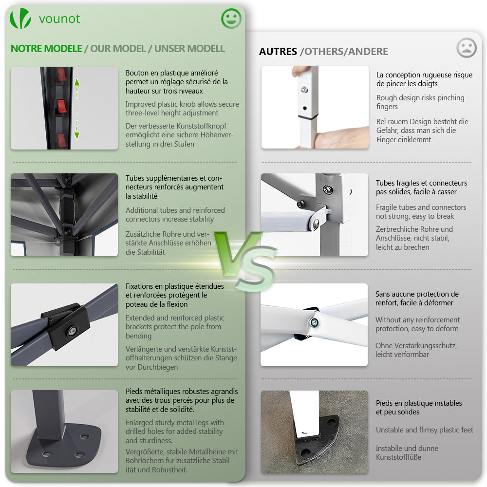 - Les quatre pieds du cadre peuvent être ajustés à trois hauteurs différentes selon vos besoins et les boutons améliorés empêchent le pincement des doigts. Le toit est équipé d'une ouverture de ventilation, permettant une circulation d'air efficace. De plus, la tonnelle est livrée avec un sac de rangement, facilitant ainsi son stockage et son déplacement.