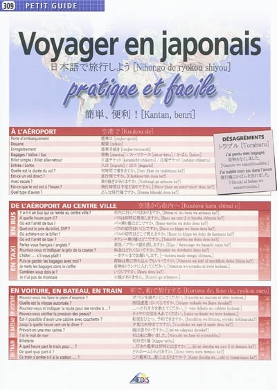 Des modèles de phrases et un lexique en fonction des situations vécues de la vie quotidienne (à l'aéroport, à l'hôtel, au restaurant, en ville) en japonais.