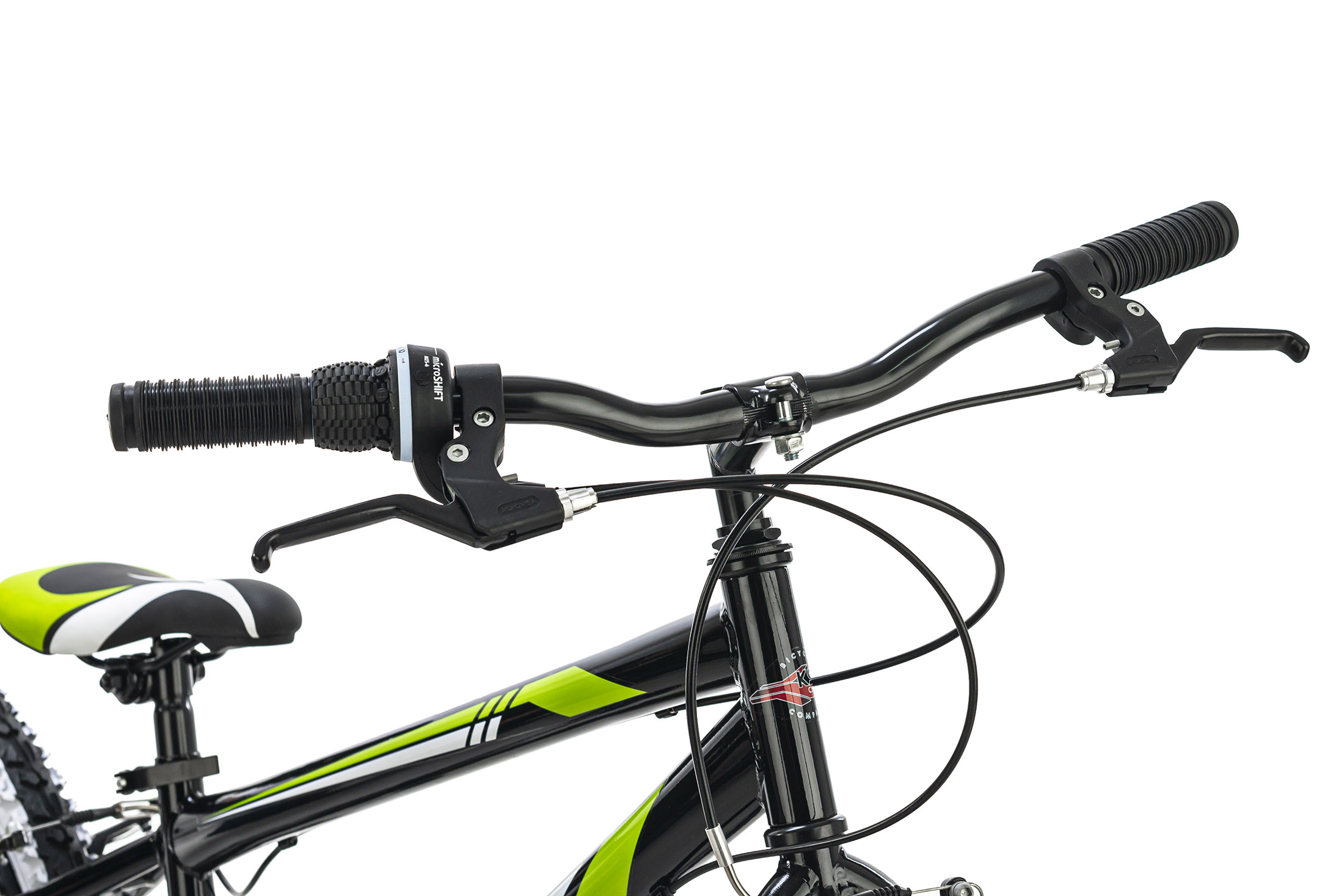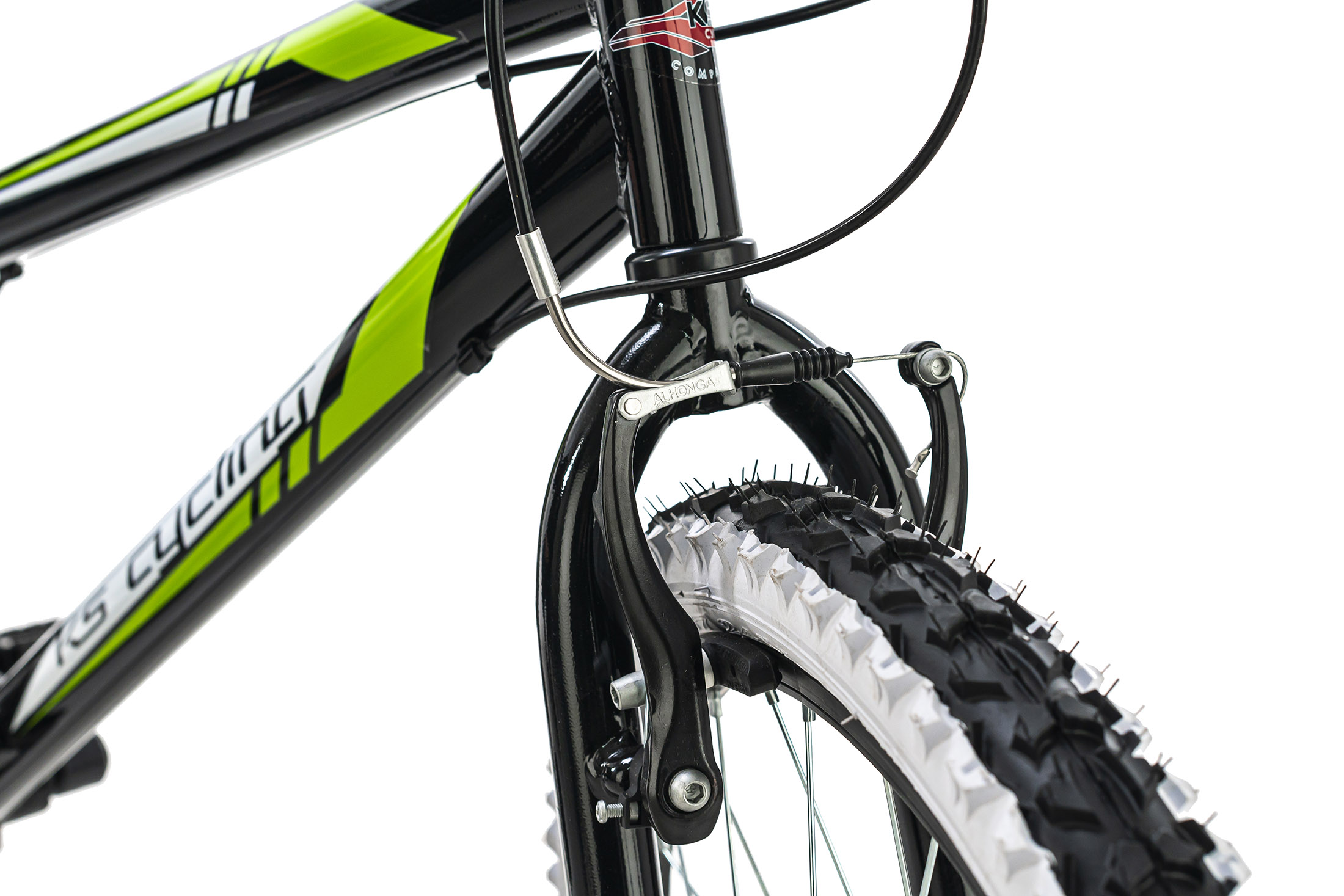 Les pneus tout terrain et le design tendance en noir et vert complètent le look de ce VTT. La sécurité est assurée par les freins V-brakes à l'avant et à l'arrière. Ce vélo est équipé d'un dérailleur SHIMANO 6 vitesses.
