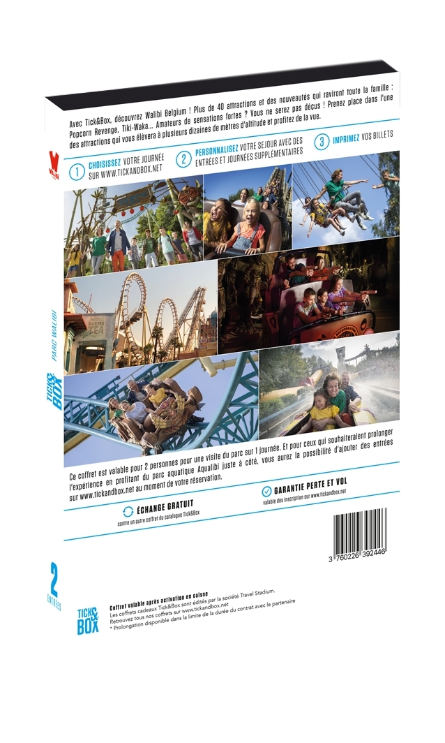 A une heure de Lille, Walibi Belgique est le plus grand parc d'attractions de Belgique. Plus de 50 attractions, des espaces thématiques, un gigantesque parc de 62 hectares de parc. De quoi vous offrir une journée de suspense et de détente en famille, de l'amusement pour les enfants, les ados et leurs parents! Avec Tick’nBox, plongez dans l'univers des plus beaux parcs à thèmes d'Europe. Dans votre Tick’nBox, vous découvrirez : Un chèque cadeau échangeable contre 2 entrées pour une journée. Ce chèque permet de réserver votre séjour en vous connectant sur le site www.ticknbox.com. Le coffret est valable pour 2 entrées, 24 mois à compter de sa date d’achat. Tick’nBox est revendeur officiel de Walibi Belgique. Choisissez votre journée et vivez une expérience unique. Votre séjour est totalement personnalisable lors de votre réservation en ligne (ajout d'entrées ou de journées supplémentaires au meilleur prix du moment).