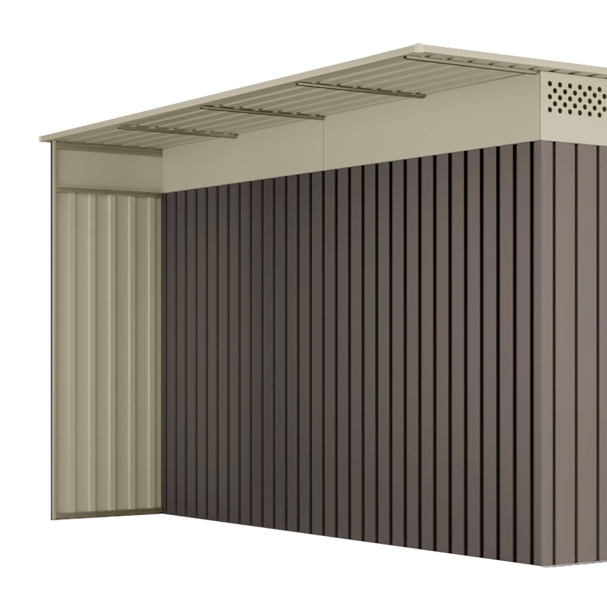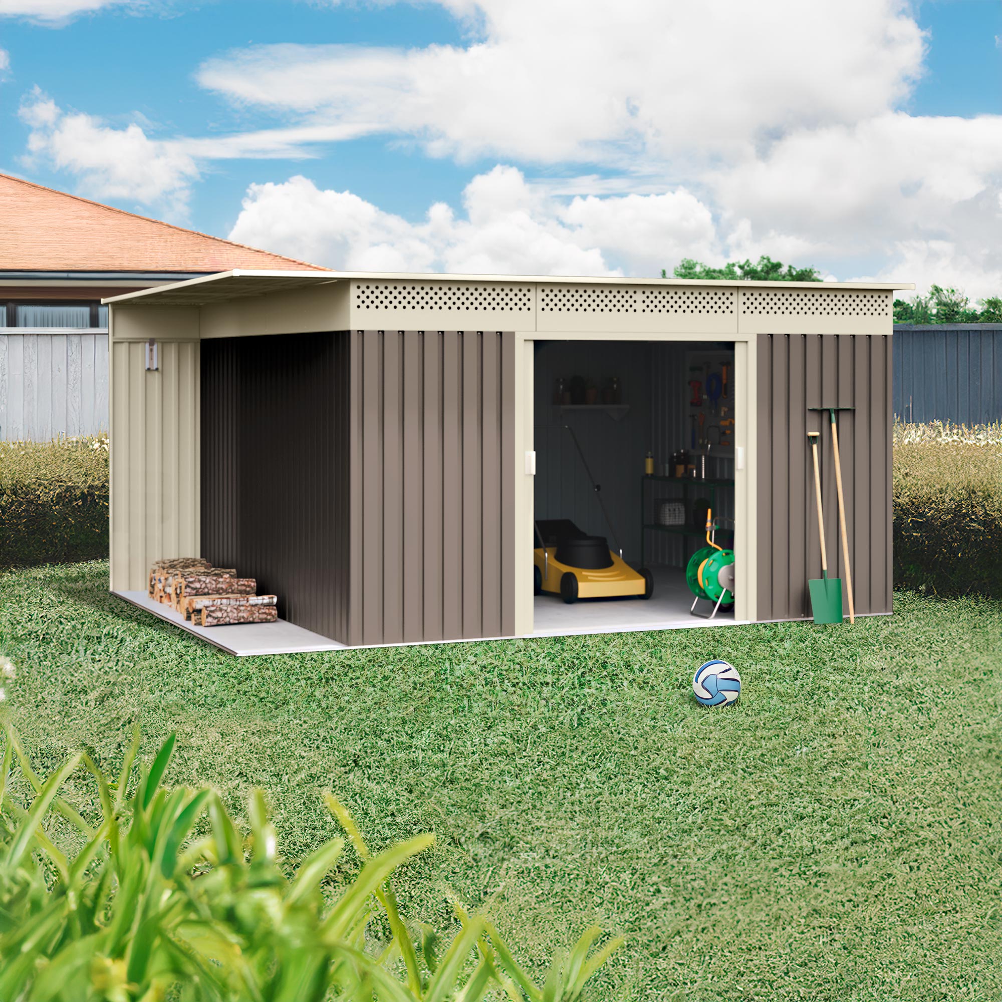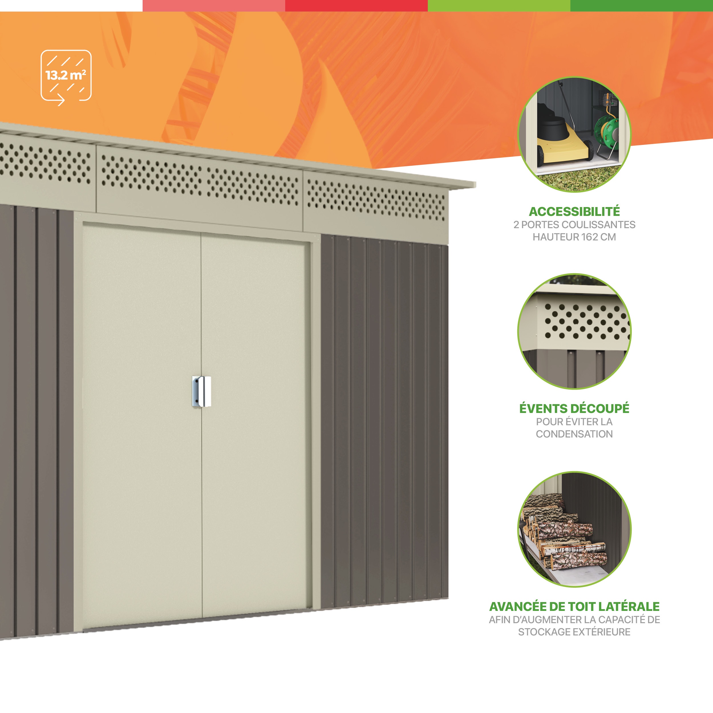 | Libellé | Wasabi - Abri de Jardin Métal 13,22m2 Coffee – Avec Bûcher - Porte coulissante double - Toit plat - Grilles de ventilation - Cabane extérieur - Caban |