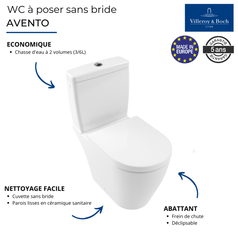 | Libellé | WC à poser sans bride VILLEROY ET BOCH Avento avec abattant frein de chute déclipsable + nettoyant Briochin |