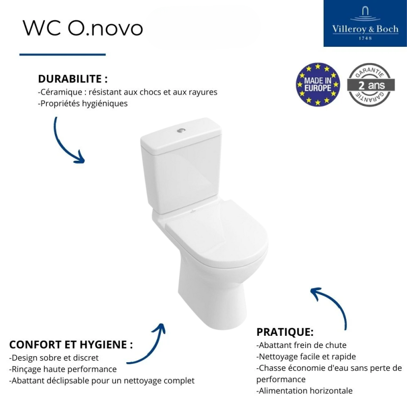 | Libellé | WC à poser sortie verticale VILLEROY ET BOCH O.novo avec abattant + nettoyant |