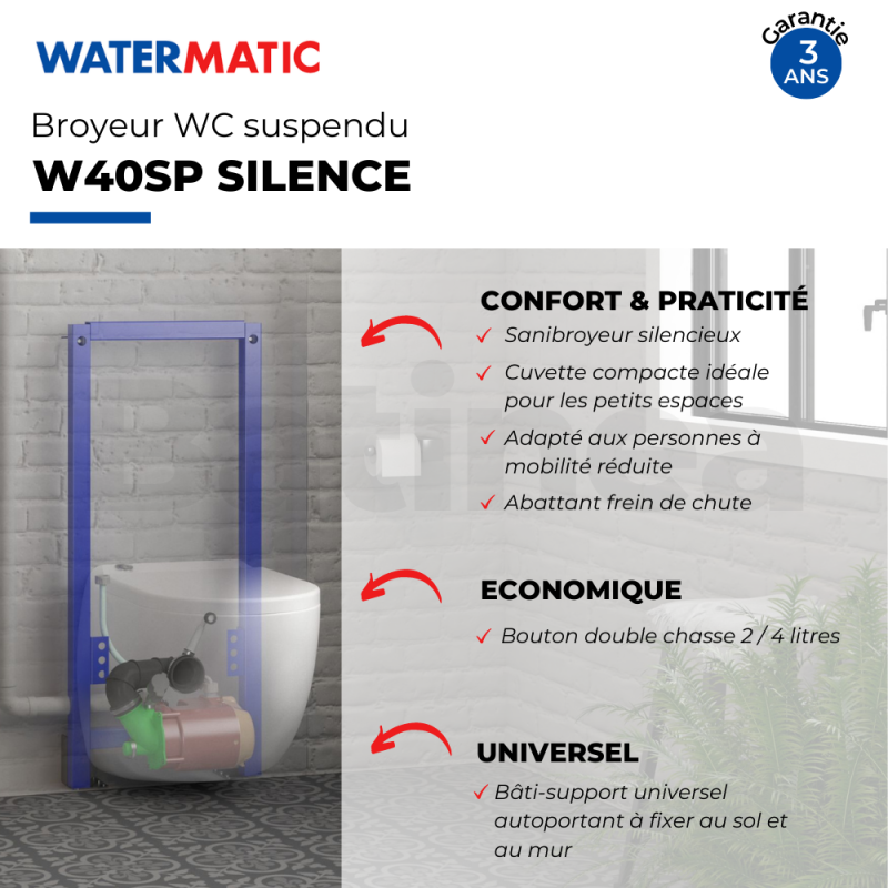 | Libellé | WC broyeur suspendu WATERMATIC W40SP Silence avec abattant |