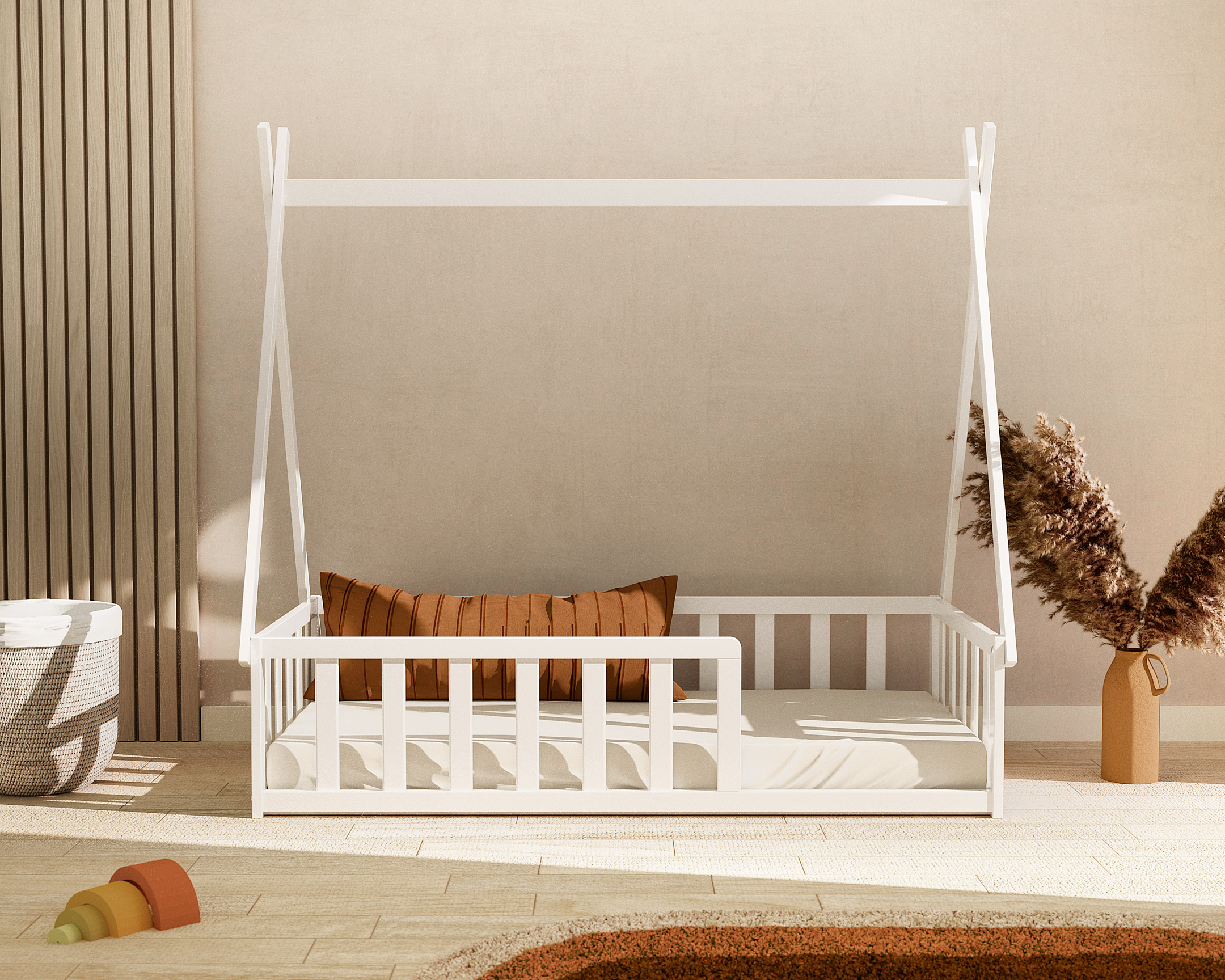 Lit Enfant Tipi au sol Avec ses petites barrières tout autour et son joli toit en forme de tipi, ce beau lit tipi au sol 70 x 140 cm est parfait pour que votre tout petit découvre les joies de l'autonomie et de la liberté en toute sécurité. Un design ludique et amusant qui participe beaucoup à la décoration dans la chambre de l'enfant. Un beau lit tipi sécurisé pour des nuits de rêve Pratique, la petite barrière qui peut être montée sur le devant, à gauche ou à droite, s'adapte à l'agencement de la pièce ! Sommier à lattes pour une meilleure ventilation du matelas et un confort de sommeil optimal. Dimensions du lit : 149 x 78 x 136 cm Poids : 16 kg Matière : bois massif Garantie : 2 ans Nécessite un matelas 70 x 140 cm d’une hauteur maxi de 15 cm NON INCLUS Conforme à la norme : NF D 60 300-4 Livré à monter soi-même