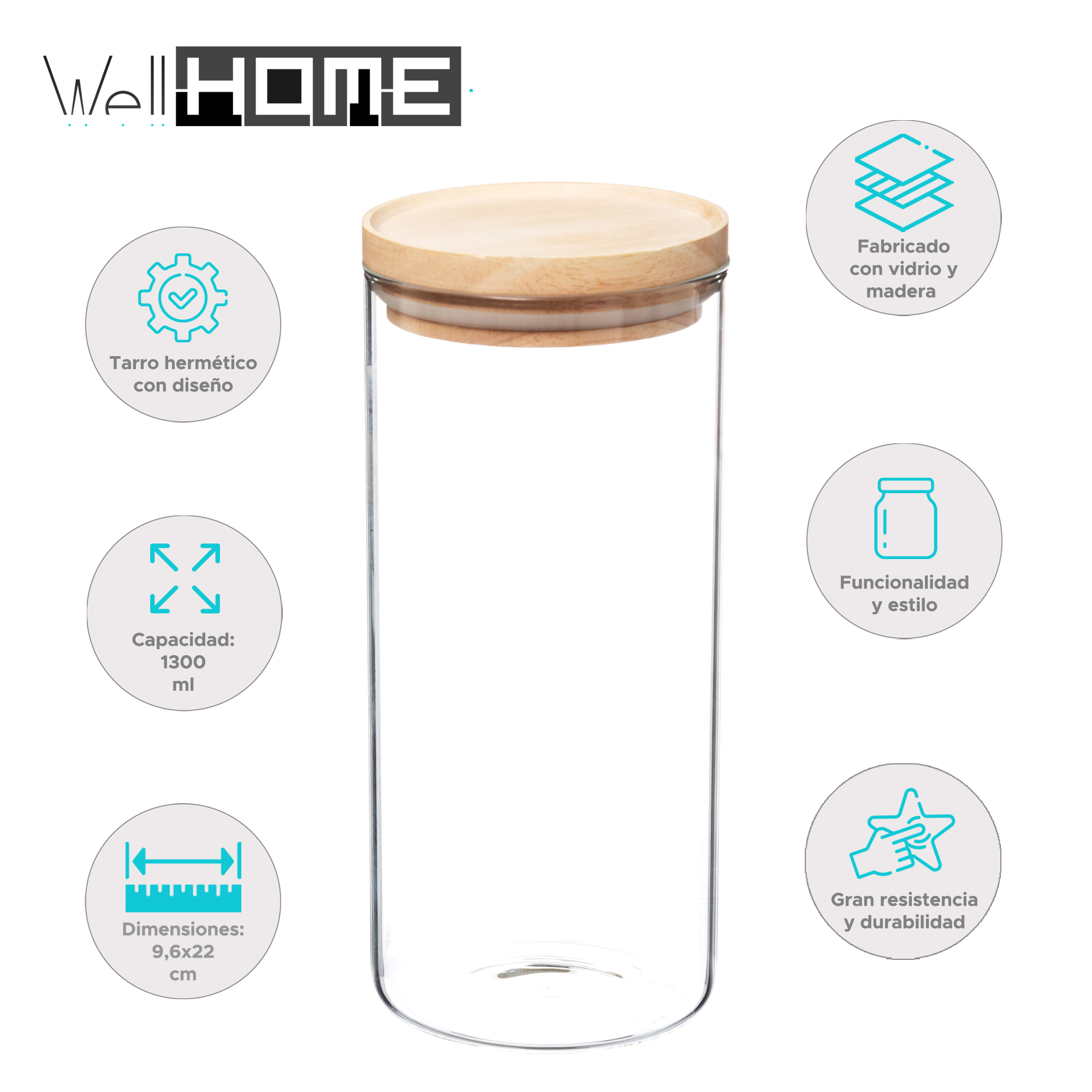 WELLHOME - Pot en verre et bois, fermeture hermétique 1,3L