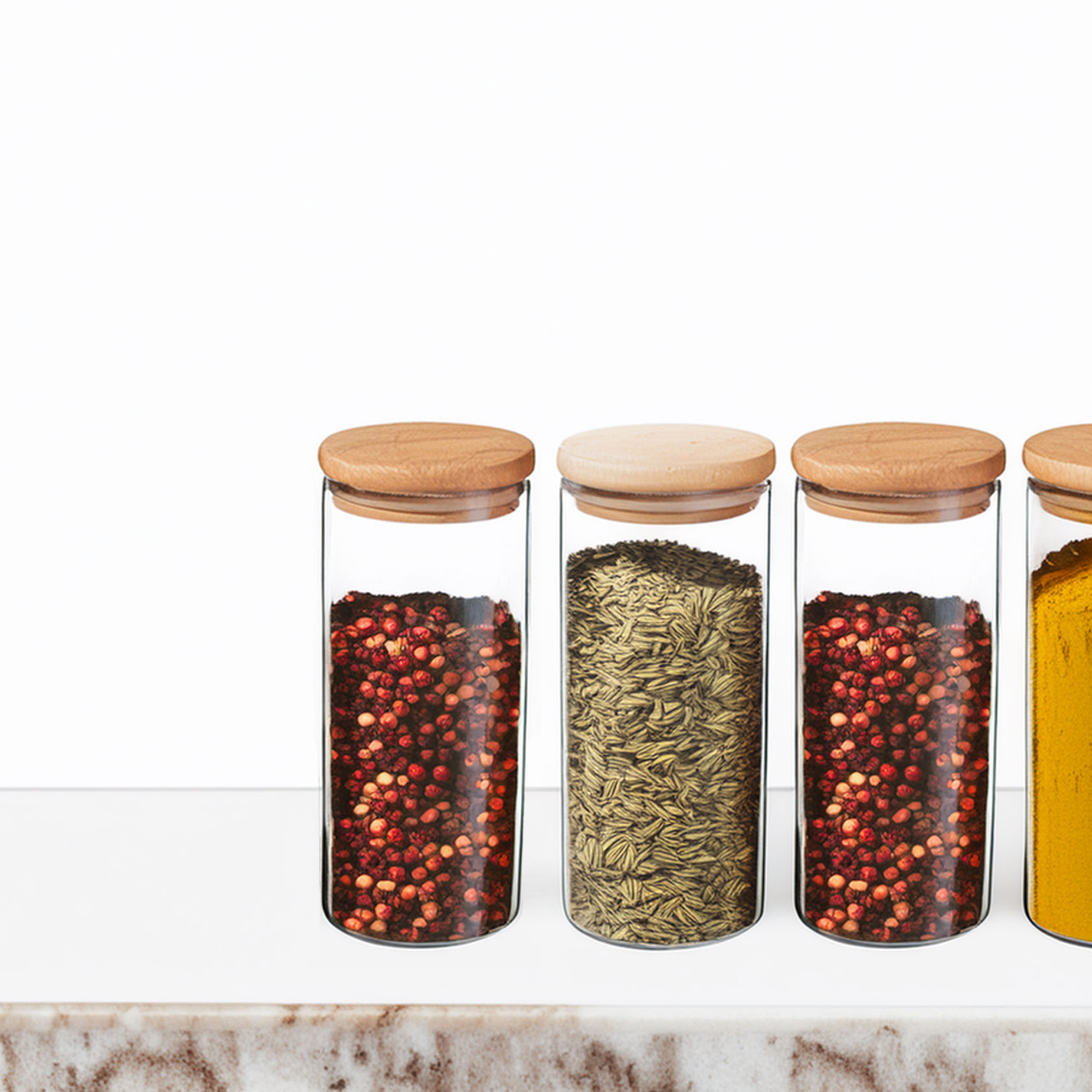 Fantastique pot hermétique en verre et en bois. Il a une grande résistance et durabilité. Joli design. Dimensions : 9,6x22cm. Capacité : 1300 ml Matériel: Verre/Bois