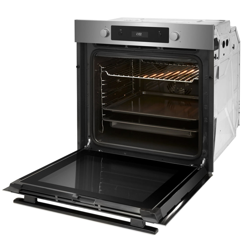 Le four multifonction pyrolyse OAKZ9 1395 P IX offre une large cavité de 73 litres et permet, grâce à la chaleur pulsée, une cuisson sur 3 niveaux sans mélange de goût ni d'odeurs. La sonde à coeur intégrée vous permet de cuire vos pièces de viande et autres plats avec précision pour un résultat parfait.