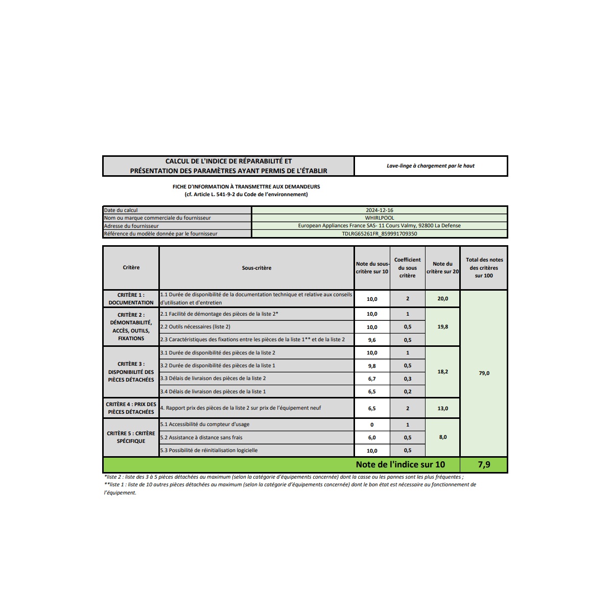 | Consommation d’énergie pour 100 cycles (kwh) | 43 |