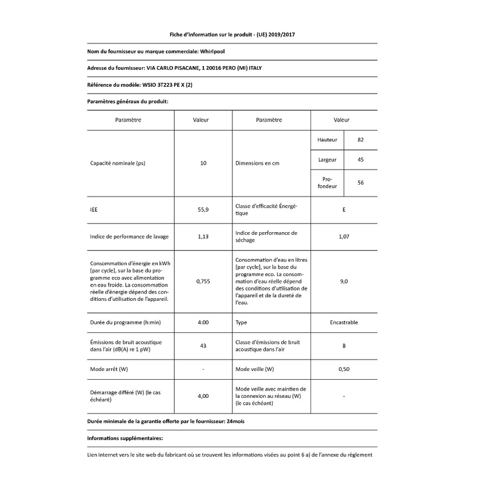 | Libellé | Whirlpool Lave-vaisselle encastrable inox 45 cm - WSIO3T223PEX - |