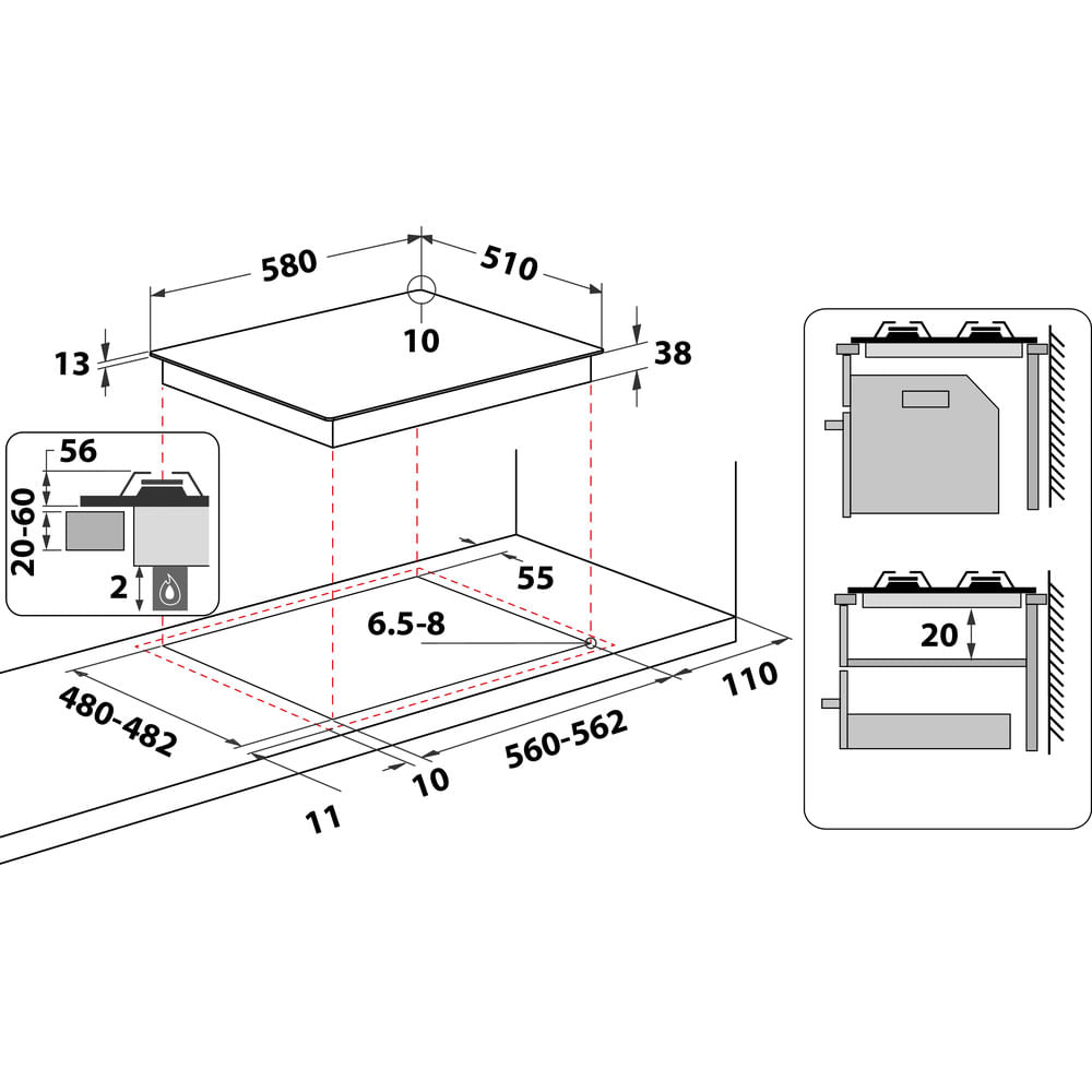 Dimensions d'encastrement 480-482 mm x 560-562 mm