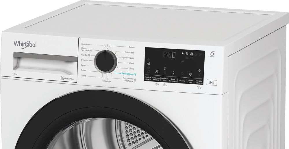 Découvrez le sèche-linge pompe à chaleur Whirlpool CWD84MWBSFR : avec sa capacité de 8 kg et sa nouvelle classe énergétique C, il allie efficacité et économie d’énergie. Grâce à la technologie 6ème Sens, il adapte automatiquement les paramètres de séchage pour des résultats impeccables. Grâce à vos retours recueillis sur l'application HomeWhiz, l'appareil redéfinit le séchage avec une touche personnalisée grâce à l’IA. Son moteur SilentSpin garantit un fonctionnement ultra-silencieux, idéal pour une utilisation à tout moment. Son design avec porte noire apporte une touche de design dans votre espace. Profitez d’un séchage en toute simplicité avec le CWD84MWBSFR !